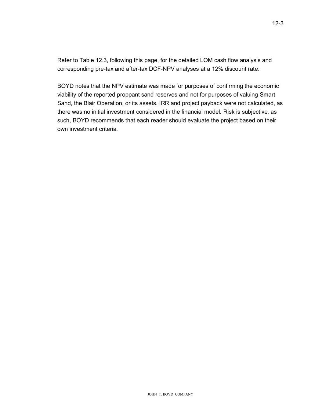 ���� ���������������������� 5HIHU�WR�7DEOH�������IROOR�LQJ�W�LV�SDJH��IRU�W�H�GHWDLOHG�/20�FDV��IOR��DQDO\VLV�DQG� FRUUHVSRQGLQJ�SUH�WD��DQG�DIWHU�WD���&)�139�DQDO\VHV�DW�D�����GLVFR�QW�UDWH�� %2<��QRWHV�W�DW�W�H�139�HVWLPDWH��DV�PDGH�IRU�S�USRVHV�RI�FRQILUPLQJ�W�H�HFRQRPLF� YLDELOLW\�RI�W�H�UHSRUWHG�SURSSDQW�VDQG�UHVHUYHV�DQG�QRW�IRU�S�USRVHV�RI�YDO�LQJ�6PDUW� 6DQG��W�H�%ODLU�2SHUDWLRQ��RU�LWV�DVVHWV��,55�DQG�SURMHFW�SD\EDFN��HUH�QRW�FDOF�ODWHG��DV� W�HUH��DV�QR�LQLWLDO�LQYHVWPHQW�FRQVLGHUHG�LQ�W�H�ILQDQFLDO�PRGHO��5LVN�LV�V�EMHFWLYH��DV� V�F���%2<��UHFRPPHQGV�W�DW�HDF��UHDGHU�V�R�OG�HYDO�DWH�W�H�SURMHFW�EDVHG�RQ�W�HLU� R�Q�LQYHVWPHQW�FULWHULD��