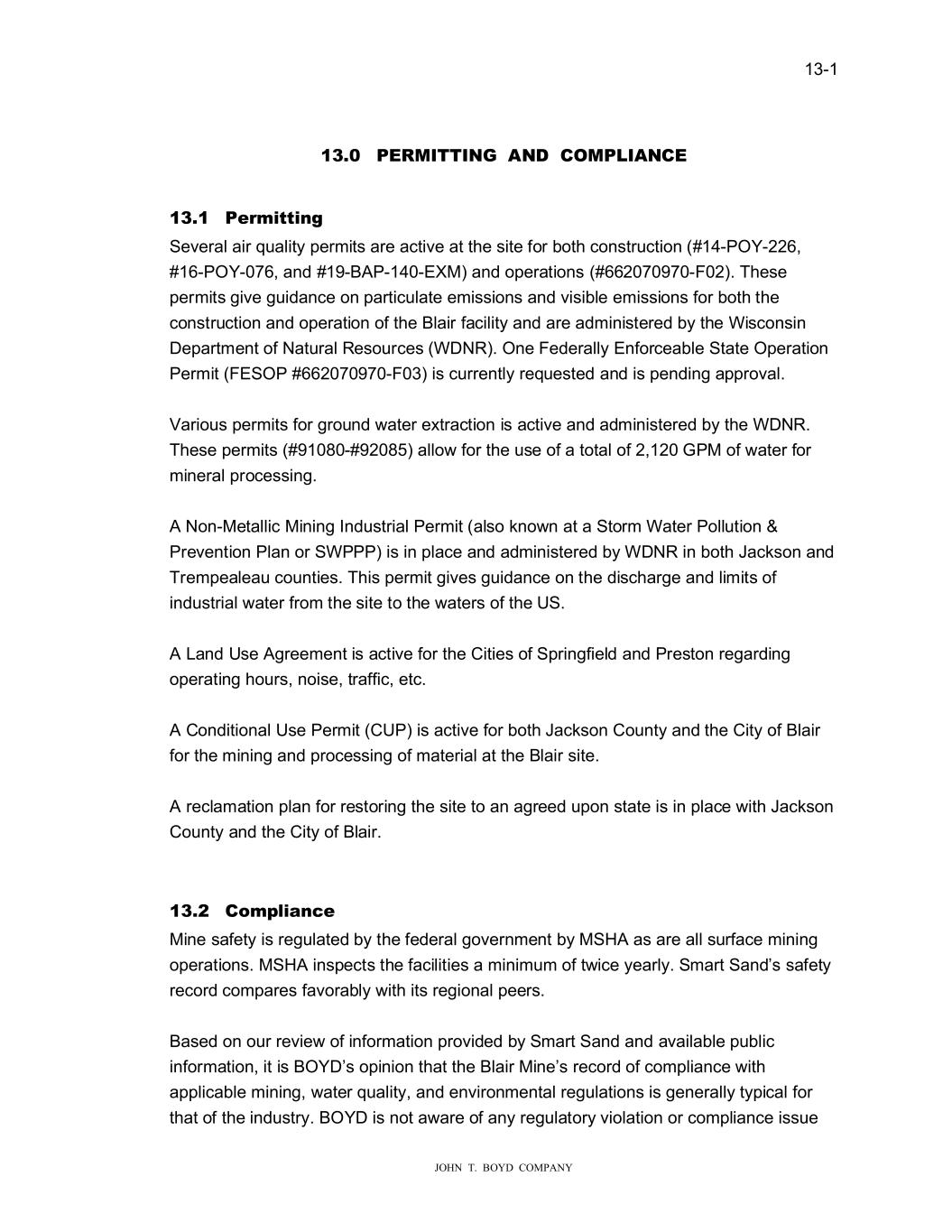 � � ����� � � � ������������������������ ����� 3��0����1����1����203���1����� � ����� 3��PL��L��� 6HYHUDO�DLU�TXDOLW\�SHUPLWV�DUH�DFWLYH�DW�W�H�VLWH�IRU�ERW��FRQVWUXFWLRQ������32������� ����32�������DQG�������3�����(�0��DQG�RSHUDWLRQV�������������)�����7�HVH� SHUPLWV�JLYH�JXLGDQFH�RQ�SDUWLFXODWH�HPLVVLRQV�DQG�YLVLEOH�HPLVVLRQV�IRU�ERW��W�H� FRQVWUXFWLRQ�DQG�RSHUDWLRQ�RI�W�H��ODLU�IDFLOLW\�DQG�DUH�DGPLQLVWHUHG�E\�W�H�:LVFRQVLQ� �HSDUWPHQW�RI�1DWXUDO�5HVRXUFHV��:�15���2QH�)HGHUDOO\�(QIRUFHDEOH�6WDWH�2SHUDWLRQ� 3HUPLW��)(623������������)����LV�FXUUHQWO\�UHTXHVWHG�DQG�LV�SHQGLQJ�DSSURYDO���� � 9DULRXV�SHUPLWV�IRU�JURXQG��DWHU�H�WUDFWLRQ�LV�DFWLYH�DQG�DGPLQLVWHUHG�E\�W�H�:�15��� 7�HVH�SHUPLWV�����������������DOOR��IRU�W�H�XVH�RI�D�WRWDO�RI��������30�RI��DWHU�IRU� PLQHUDO�SURFHVVLQJ���� � ��1RQ�0HWDOOLF�0LQLQJ�,QGXVWULDO�3HUPLW��DOVR�NQR�Q�DW�D�6WRUP�:DWHU�3ROOXWLRQ��� 3UHYHQWLRQ�3ODQ�RU�6:333��LV�LQ�SODFH�DQG�DGPLQLVWHUHG�E\�:�15�LQ�ERW��-DFNVRQ�DQG� 7UHPSHDOHDX�FRXQWLHV��7�LV�SHUPLW�JLYHV�JXLGDQFH�RQ�W�H�GLVF�DUJH�DQG�OLPLWV�RI� LQGXVWULDO��DWHU�IURP�W�H�VLWH�WR�W�H��DWHUV�RI�W�H�86�� � ���DQG�8VH��JUHHPHQW�LV�DFWLYH�IRU�W�H�&LWLHV�RI�6SULQJILHOG�DQG�3UHVWRQ�UHJDUGLQJ� RSHUDWLQJ��RXUV��QRLVH��WUDIILF��HWF���� � ��&RQGLWLRQDO�8VH�3HUPLW��&83��LV�DFWLYH�IRU�ERW��-DFNVRQ�&RXQW\�DQG�W�H�&LW\�RI��ODLU� IRU�W�H�PLQLQJ�DQG�SURFHVVLQJ�RI�PDWHULDO�DW�W�H��ODLU�VLWH�� � ��UHFODPDWLRQ�SODQ�IRU�UHVWRULQJ�W�H�VLWH�WR�DQ�DJUHHG�XSRQ�VWDWH�LV�LQ�SODFH��LW��-DFNVRQ� &RXQW\�DQG�W�H�&LW\�RI��ODLU����� � � ����� �RP�OLD���� 0LQH�VDIHW\�LV�UHJXODWHG�E\�W�H�IHGHUDO�JRYHUQPHQW�E\�06���DV�DUH�DOO�VXUIDFH�PLQLQJ� RSHUDWLRQV��06���LQVSHFWV�W�H�IDFLOLWLHV�D�PLQLPXP�RI�W�LFH�\HDUO\��6PDUW�6DQG�V�VDIHW\� UHFRUG�FRPSDUHV�IDYRUDEO\��LW��LWV�UHJLRQDO�SHHUV��� � �DVHG�RQ�RXU�UHYLH��RI�LQIRUPDWLRQ�SURYLGHG�E\�6PDUW�6DQG�DQG�DYDLODEOH�SXEOLF� LQIRUPDWLRQ��LW�LV��2���V�RSLQLRQ�W�DW�W�H��ODLU�0LQH�V�UHFRUG�RI�FRPSOLDQFH��LW�� DSSOLFDEOH�PLQLQJ���DWHU�TXDOLW\��DQG�HQYLURQPHQWDO�UHJXODWLRQV�LV�JHQHUDOO\�W\SLFDO�IRU� W�DW�RI�W�H�LQGXVWU\���2���LV�QRW�D�DUH�RI�DQ\�UHJXODWRU\�YLRODWLRQ�RU�FRPSOLDQFH�LVVXH�