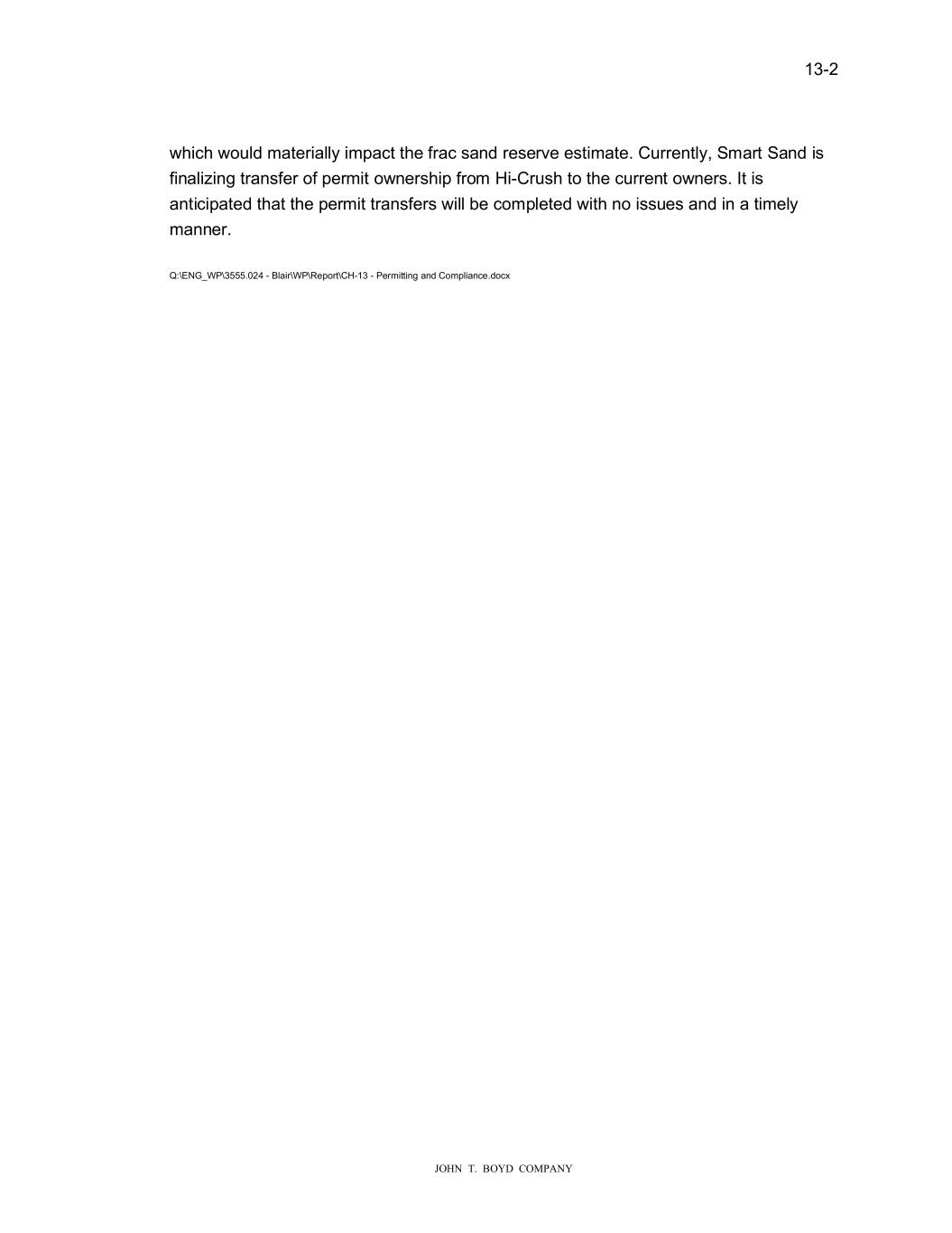 � � ����� � � � ������������������������ ��LF���RXOG�PDWHULDOO\�LPSDFW�W�H�IUDF�VDQG�UHVHUYH�HVWLPDWH��&XUUHQWO\��6PDUW�6DQG�LV� ILQDOL�LQJ�WUDQVIHU�RI�SHUPLW�R�QHUV�LS�IURP��L�&UXV��WR�W�H�FXUUHQW�R�QHUV��,W�LV� DQWLFLSDWHG�W�DW�W�H�SHUPLW�WUDQVIHUV��LOO�EH�FRPSOHWHG��LW��QR�LVVXHV�DQG�LQ�D�WLPHO\� PDQQHU���� � 4��(1�B:3�������������ODLU�:3�5HSRUW�&�������3HUPLWWLQJ�DQG�&RPSOLDQFH�GRF��