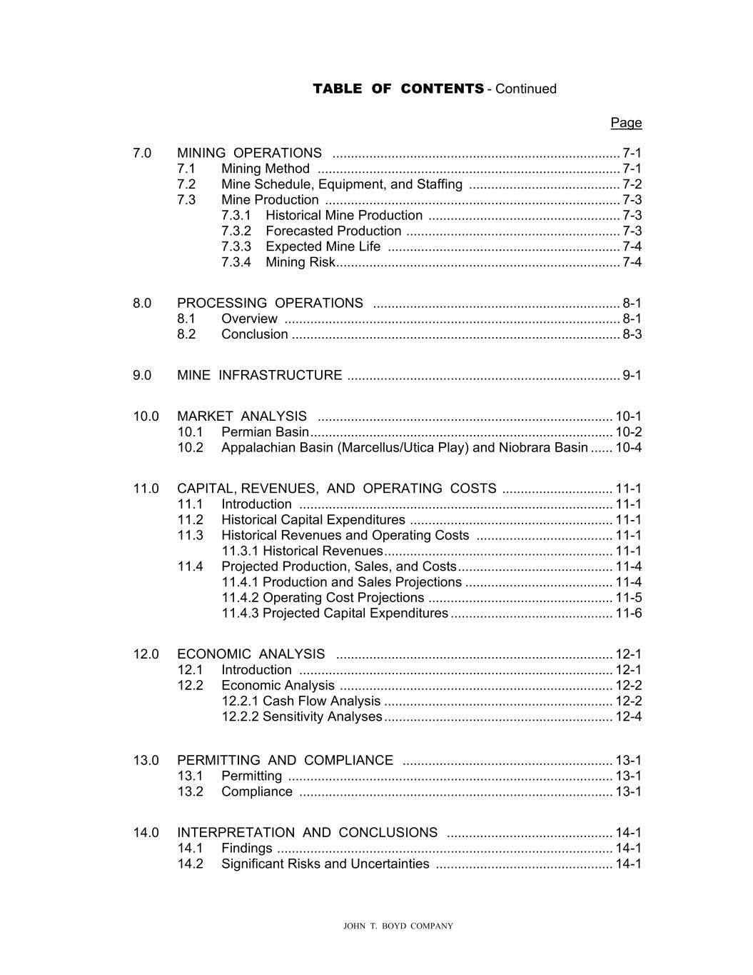 TABLE OF CONTENTS - Continued Page JOHN T. BOYD COMPANY 7.0 MINING OPERATIONS .............................................................................. 7-1 7.1 Mining Method .................................................................................. 7-1 7.2 Mine Schedule, Equipment, and Staffing ......................................... 7-2 7.3 Mine Production ................................................................................ 7-3 7.3.1 Historical Mine Production .................................................... 7-3 7.3.2 Forecasted Production .......................................................... 7-3 7.3.3 Expected Mine Life ............................................................... 7-4 7.3.4 Mining Risk ............................................................................. 7-4 8.0 PROCESSING OPERATIONS ................................................................... 8-1 8.1 Overview ........................................................................................... 8-1 8.2 Conclusion ......................................................................................... 8-3 9.0 MINE INFRASTRUCTURE .......................................................................... 9-1 10.0 MARKET ANALYSIS ................................................................................ 10-1 10.1 Permian Basin .................................................................................. 10-2 10.2 Appalachian Basin (Marcellus/Utica Play) and Niobrara Basin ...... 10-4 11.0 CAPITAL, REVENUES, AND OPERATING COSTS .............................. 11-1 11.1 Introduction ..................................................................................... 11-1 11.2 Historical Capital Expenditures ....................................................... 11-1 11.3 Historical Revenues and Operating Costs ..................................... 11-1 11.3.1 Historical Revenues .............................................................. 11-1 11.4 Projected Production, Sales, and Costs .......................................... 11-4 11.4.1 Production and Sales Projections ........................................ 11-4 11.4.2 Operating Cost Projections .................................................. 11-5 11.4.3 Projected Capital Expenditures ............................................ 11-6 12.0 ECONOMIC ANALYSIS ........................................................................... 12-1 12.1 Introduction ..................................................................................... 12-1 12.2 Economic Analysis .......................................................................... 12-2 12.2.1 Cash Flow Analysis .............................................................. 12-2 12.2.2 Sensitivity Analyses .............................................................. 12-4 13.0 PERMITTING AND COMPLIANCE ......................................................... 13-1 13.1 Permitting ........................................................................................ 13-1 13.2 Compliance ..................................................................................... 13-1 14.0 INTERPRETATION AND CONCLUSIONS ............................................. 14-1 14.1 Findings ........................................................................................... 14-1 14.2 Significant Risks and Uncertainties ................................................ 14-1