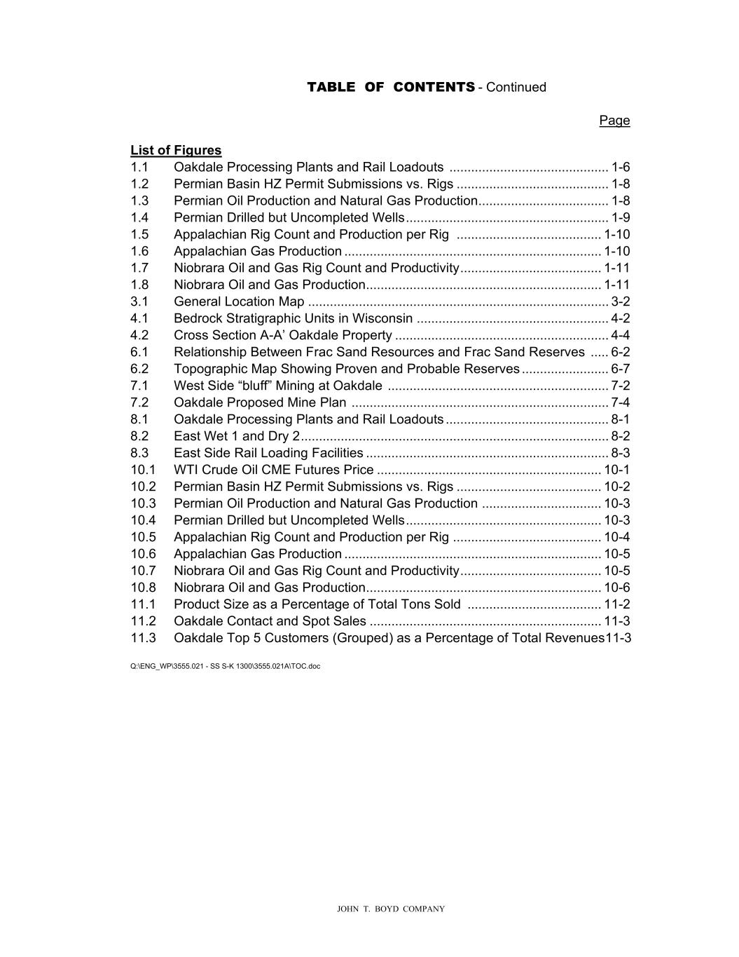 TABLE OF CONTENTS - Continued Page JOHN T. BOYD COMPANY List of Figures 1.1 Oakdale Processing Plants and Rail Loadouts ............................................ 1-6 1.2 Permian Basin HZ Permit Submissions vs. Rigs .......................................... 1-8 1.3 Permian Oil Production and Natural Gas Production .................................... 1-8 1.4 Permian Drilled but Uncompleted Wells ........................................................ 1-9 1.5 Appalachian Rig Count and Production per Rig ........................................ 1-10 1.6 Appalachian Gas Production ....................................................................... 1-10 1.7 Niobrara Oil and Gas Rig Count and Productivity ....................................... 1-11 1.8 Niobrara Oil and Gas Production................................................................. 1-11 3.1 General Location Map ................................................................................... 3-2 4.1 Bedrock Stratigraphic Units in Wisconsin ..................................................... 4-2 4.2 Cross Section A-A’ Oakdale Property ........................................................... 4-4 6.1 Relationship Between Frac Sand Resources and Frac Sand Reserves ..... 6-2 6.2 Topographic Map Showing Proven and Probable Reserves ........................ 6-7 7.1 West Side “bluff” Mining at Oakdale ............................................................. 7-2 7.2 Oakdale Proposed Mine Plan ....................................................................... 7-4 8.1 Oakdale Processing Plants and Rail Loadouts ............................................. 8-1 8.2 East Wet 1 and Dry 2 ..................................................................................... 8-2 8.3 East Side Rail Loading Facilities ................................................................... 8-3 10.1 WTI Crude Oil CME Futures Price .............................................................. 10-1 10.2 Permian Basin HZ Permit Submissions vs. Rigs ........................................ 10-2 10.3 Permian Oil Production and Natural Gas Production ................................. 10-3 10.4 Permian Drilled but Uncompleted Wells ...................................................... 10-3 10.5 Appalachian Rig Count and Production per Rig ......................................... 10-4 10.6 Appalachian Gas Production ....................................................................... 10-5 10.7 Niobrara Oil and Gas Rig Count and Productivity ....................................... 10-5 10.8 Niobrara Oil and Gas Production................................................................. 10-6 11.1 Product Size as a Percentage of Total Tons Sold ..................................... 11-2 11.2 Oakdale Contact and Spot Sales ................................................................ 11-3 11.3 Oakdale Top 5 Customers (Grouped) as a Percentage of Total Revenues11-3 Q:\ENG_WP\3555.021 - SS S-K 1300\3555.021A\TOC.doc