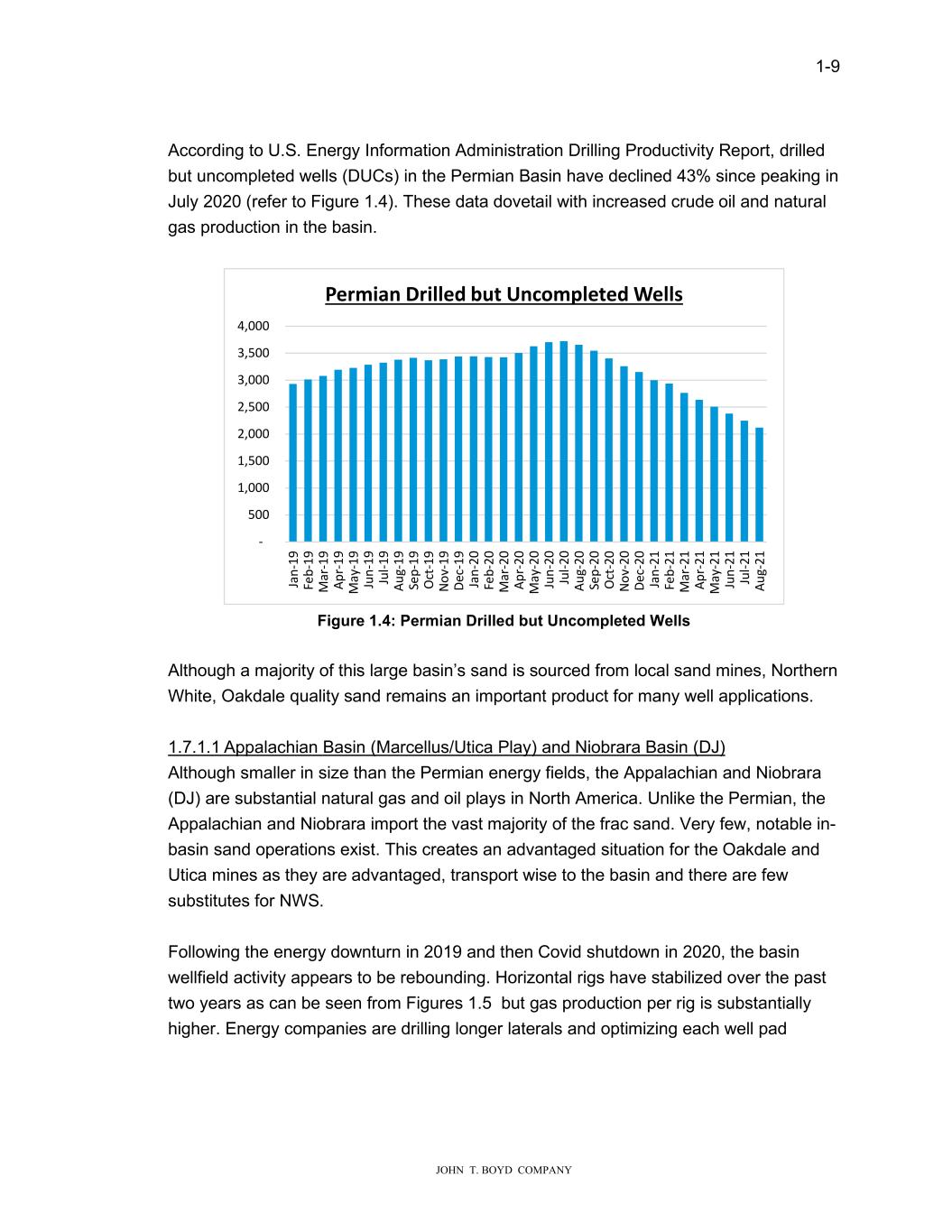 1-9 JOHN T. BOYD COMPANY According to U.S. Energy Information Administration Drilling Productivity Report, drilled but uncompleted wells (DUCs) in the Permian Basin have declined 43% since peaking in July 2020 (refer to Figure 1.4). These data dovetail with increased crude oil and natural gas production in the basin. Figure 1.4: Permian Drilled but Uncompleted Wells Although a majority of this large basin’s sand is sourced from local sand mines, Northern White, Oakdale quality sand remains an important product for many well applications. 1.7.1.1 Appalachian Basin (Marcellus/Utica Play) and Niobrara Basin (DJ) Although smaller in size than the Permian energy fields, the Appalachian and Niobrara (DJ) are substantial natural gas and oil plays in North America. Unlike the Permian, the Appalachian and Niobrara import the vast majority of the frac sand. Very few, notable in- basin sand operations exist. This creates an advantaged situation for the Oakdale and Utica mines as they are advantaged, transport wise to the basin and there are few substitutes for NWS. Following the energy downturn in 2019 and then Covid shutdown in 2020, the basin wellfield activity appears to be rebounding. Horizontal rigs have stabilized over the past two years as can be seen from Figures 1.5 but gas production per rig is substantially higher. Energy companies are drilling longer laterals and optimizing each well pad - 500 1,000 1,500 2,000 2,500 3,000 3,500 4,000 Ja n- 19 Fe b- 19 M ar -1 9 Ap r- 19 M ay -1 9 Ju n- 19 Ju l-1 9 Au g- 19 Se p- 19 O ct -1 9 N ov -1 9 De c- 19 Ja n- 20 Fe b- 20 M ar -2 0 Ap r- 20 M ay -2 0 Ju n- 20 Ju l-2 0 Au g- 20 Se p- 20 O ct -2 0 N ov -2 0 De c- 20 Ja n- 21 Fe b- 21 M ar -2 1 Ap r- 21 M ay -2 1 Ju n- 21 Ju l-2 1 Au g- 21 Permian Drilled but Uncompleted Wells