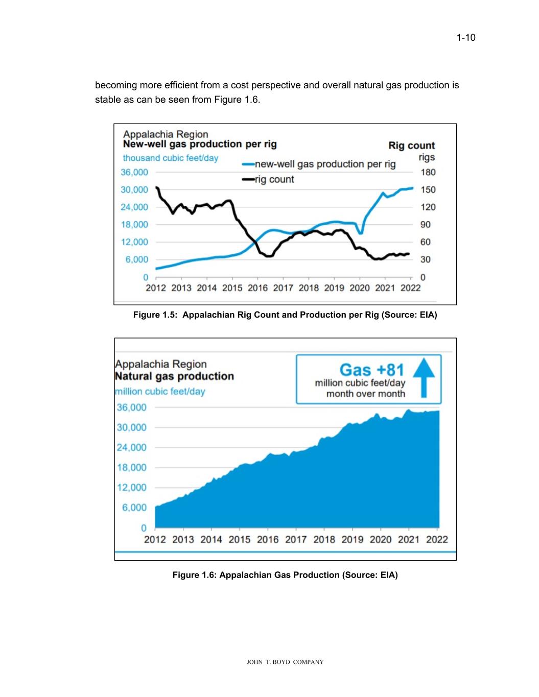 1-10 JOHN T. BOYD COMPANY becoming more efficient from a cost perspective and overall natural gas production is stable as can be seen from Figure 1.6. Figure 1.5: Appalachian Rig Count and Production per Rig (Source: EIA) Figure 1.6: Appalachian Gas Production (Source: EIA)