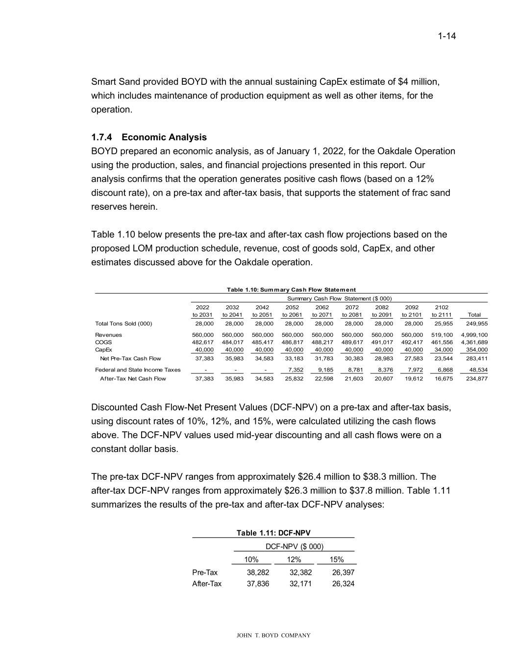 1-14 JOHN T. BOYD COMPANY Smart Sand provided BOYD with the annual sustaining CapEx estimate of $4 million, which includes maintenance of production equipment as well as other items, for the operation. 1.7.4 Economic Analysis BOYD prepared an economic analysis, as of January 1, 2022, for the Oakdale Operation using the production, sales, and financial projections presented in this report. Our analysis confirms that the operation generates positive cash flows (based on a 12% discount rate), on a pre-tax and after-tax basis, that supports the statement of frac sand reserves herein. Table 1.10 below presents the pre-tax and after-tax cash flow projections based on the proposed LOM production schedule, revenue, cost of goods sold, CapEx, and other estimates discussed above for the Oakdale operation. Table 1.10: Summary Cash Flow Statement Summary Cash Flow Statement ($ 000) 2022 2032 2042 2052 2062 2072 2082 2092 2102 to 2031 to 2041 to 2051 to 2061 to 2071 to 2081 to 2091 to 2101 to 2111 Total Total Tons Sold (000) 28,000 28,000 28,000 28,000 28,000 28,000 28,000 28,000 25,955 249,955 Revenues 560,000 560,000 560,000 560,000 560,000 560,000 560,000 560,000 519,100 4,999,100 COGS 482,617 484,017 485,417 486,817 488,217 489,617 491,017 492,417 461,556 4,361,689 CapEx 40,000 40,000 40,000 40,000 40,000 40,000 40,000 40,000 34,000 354,000 Net Pre-Tax Cash Flow 37,383 35,983 34,583 33,183 31,783 30,383 28,983 27,583 23,544 283,411 Federal and State Income Taxes - - - 7,352 9,185 8,781 8,376 7,972 6,868 48,534 After-Tax Net Cash Flow 37,383 35,983 34,583 25,832 22,598 21,603 20,607 19,612 16,675 234,877 Discounted Cash Flow-Net Present Values (DCF-NPV) on a pre-tax and after-tax basis, using discount rates of 10%, 12%, and 15%, were calculated utilizing the cash flows above. The DCF-NPV values used mid-year discounting and all cash flows were on a constant dollar basis. The pre-tax DCF-NPV ranges from approximately $26.4 million to $38.3 million. The after-tax DCF-NPV ranges from approximately $26.3 million to $37.8 million. Table 1.11 summarizes the results of the pre-tax and after-tax DCF-NPV analyses: DCF-NPV ($ 000) 10% 12% 15% Pre-Tax 38,282 32,382 26,397 After-Tax 37,836 32,171 26,324 Table 1.11: DCF-NPV