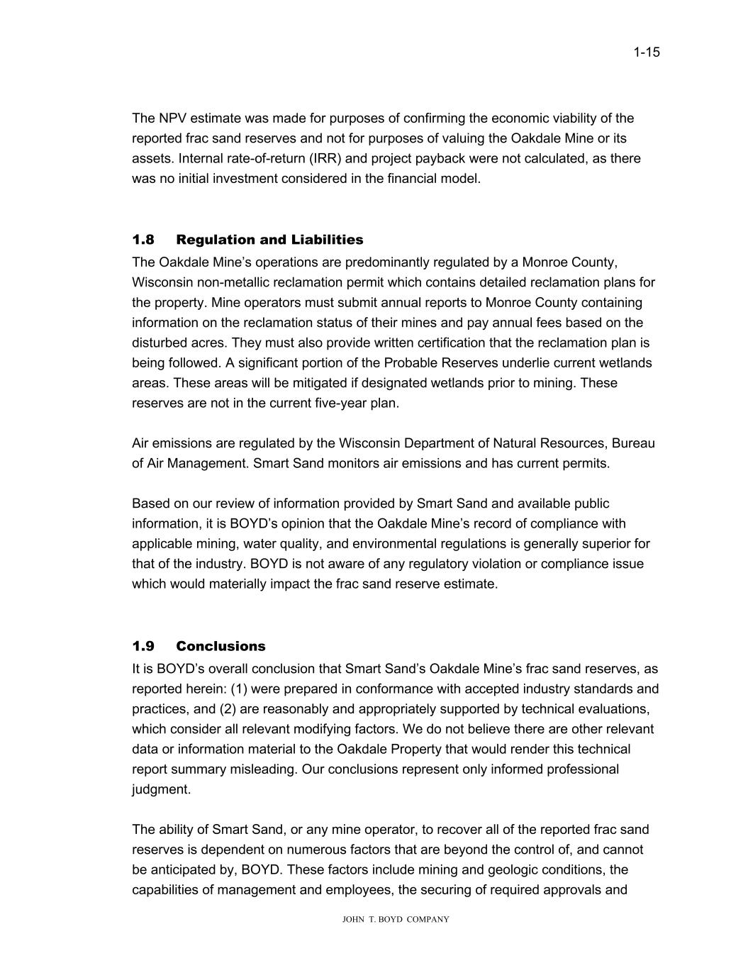 1-15 JOHN T. BOYD COMPANY The NPV estimate was made for purposes of confirming the economic viability of the reported frac sand reserves and not for purposes of valuing the Oakdale Mine or its assets. Internal rate-of-return (IRR) and project payback were not calculated, as there was no initial investment considered in the financial model. 1.8 Regulation and Liabilities The Oakdale Mine’s operations are predominantly regulated by a Monroe County, Wisconsin non-metallic reclamation permit which contains detailed reclamation plans for the property. Mine operators must submit annual reports to Monroe County containing information on the reclamation status of their mines and pay annual fees based on the disturbed acres. They must also provide written certification that the reclamation plan is being followed. A significant portion of the Probable Reserves underlie current wetlands areas. These areas will be mitigated if designated wetlands prior to mining. These reserves are not in the current five-year plan. Air emissions are regulated by the Wisconsin Department of Natural Resources, Bureau of Air Management. Smart Sand monitors air emissions and has current permits. Based on our review of information provided by Smart Sand and available public information, it is BOYD’s opinion that the Oakdale Mine’s record of compliance with applicable mining, water quality, and environmental regulations is generally superior for that of the industry. BOYD is not aware of any regulatory violation or compliance issue which would materially impact the frac sand reserve estimate. 1.9 Conclusions It is BOYD’s overall conclusion that Smart Sand’s Oakdale Mine’s frac sand reserves, as reported herein: (1) were prepared in conformance with accepted industry standards and practices, and (2) are reasonably and appropriately supported by technical evaluations, which consider all relevant modifying factors. We do not believe there are other relevant data or information material to the Oakdale Property that would render this technical report summary misleading. Our conclusions represent only informed professional judgment. The ability of Smart Sand, or any mine operator, to recover all of the reported frac sand reserves is dependent on numerous factors that are beyond the control of, and cannot be anticipated by, BOYD. These factors include mining and geologic conditions, the capabilities of management and employees, the securing of required approvals and