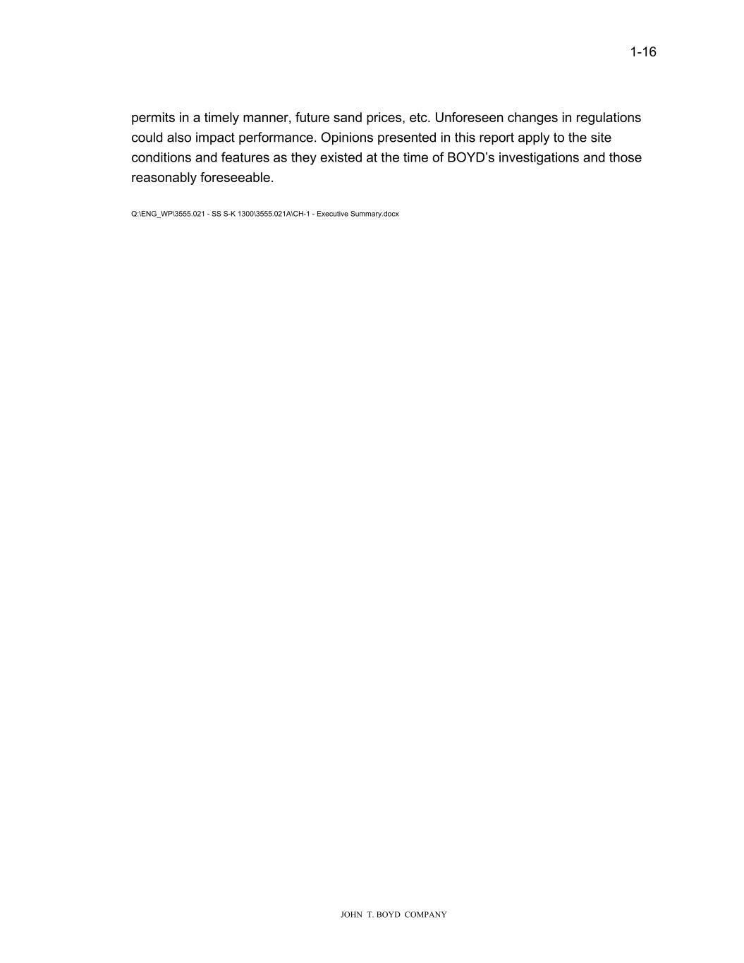 1-16 JOHN T. BOYD COMPANY permits in a timely manner, future sand prices, etc. Unforeseen changes in regulations could also impact performance. Opinions presented in this report apply to the site conditions and features as they existed at the time of BOYD’s investigations and those reasonably foreseeable. Q:\ENG_WP\3555.021 - SS S-K 1300\3555.021A\CH-1 - Executive Summary.docx