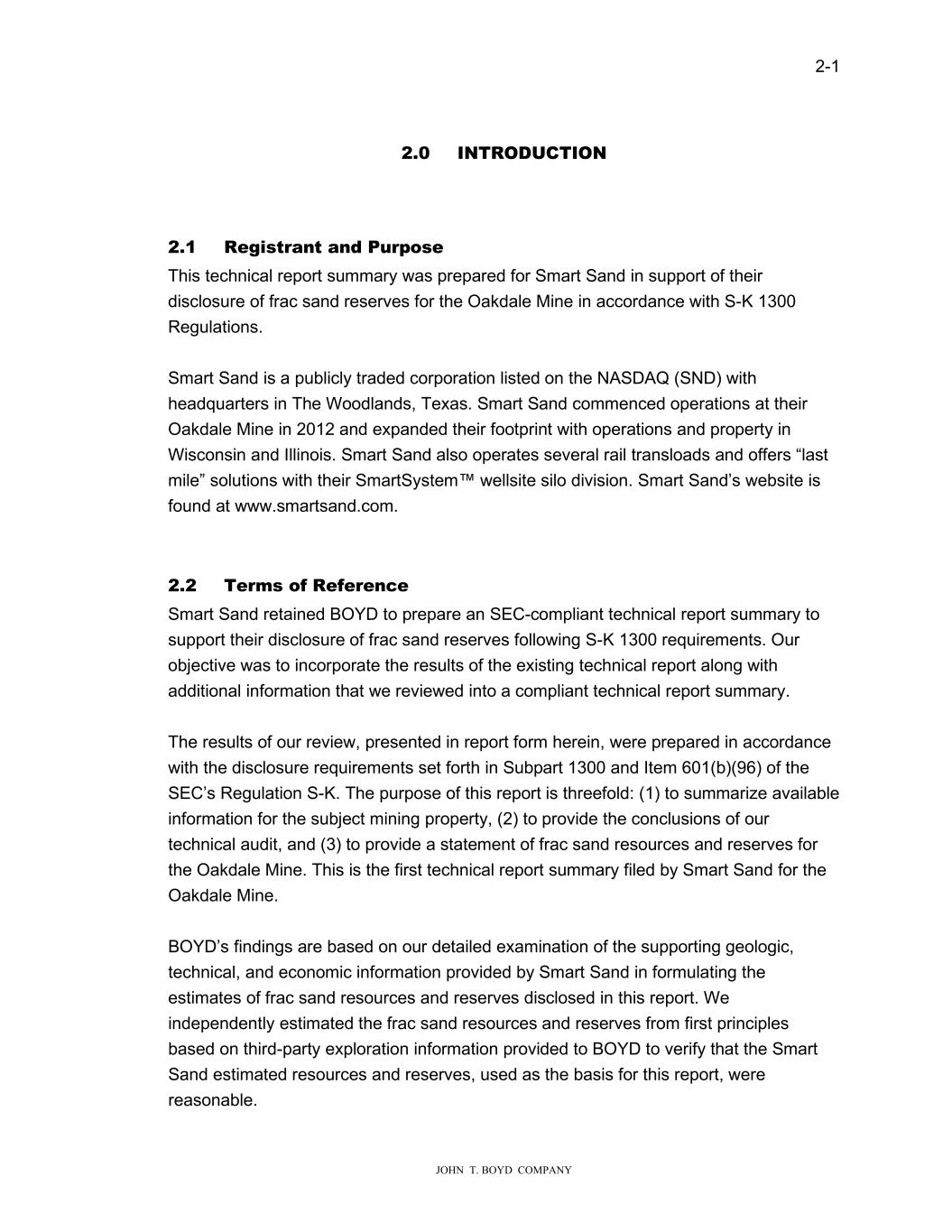 2-1 JOHN T. BOYD COMPANY 2.0 INTRODUCTION 2.1 Registrant and Purpose This technical report summary was prepared for Smart Sand in support of their disclosure of frac sand reserves for the Oakdale Mine in accordance with S-K 1300 Regulations. Smart Sand is a publicly traded corporation listed on the NASDAQ (SND) with headquarters in The Woodlands, Texas. Smart Sand commenced operations at their Oakdale Mine in 2012 and expanded their footprint with operations and property in Wisconsin and Illinois. Smart Sand also operates several rail transloads and offers “last mile” solutions with their SmartSystem™ wellsite silo division. Smart Sand’s website is found at www.smartsand.com. 2.2 Terms of Reference Smart Sand retained BOYD to prepare an SEC-compliant technical report summary to support their disclosure of frac sand reserves following S-K 1300 requirements. Our objective was to incorporate the results of the existing technical report along with additional information that we reviewed into a compliant technical report summary. The results of our review, presented in report form herein, were prepared in accordance with the disclosure requirements set forth in Subpart 1300 and Item 601(b)(96) of the SEC’s Regulation S-K. The purpose of this report is threefold: (1) to summarize available information for the subject mining property, (2) to provide the conclusions of our technical audit, and (3) to provide a statement of frac sand resources and reserves for the Oakdale Mine. This is the first technical report summary filed by Smart Sand for the Oakdale Mine. BOYD’s findings are based on our detailed examination of the supporting geologic, technical, and economic information provided by Smart Sand in formulating the estimates of frac sand resources and reserves disclosed in this report. We independently estimated the frac sand resources and reserves from first principles based on third-party exploration information provided to BOYD to verify that the Smart Sand estimated resources and reserves, used as the basis for this report, were reasonable.