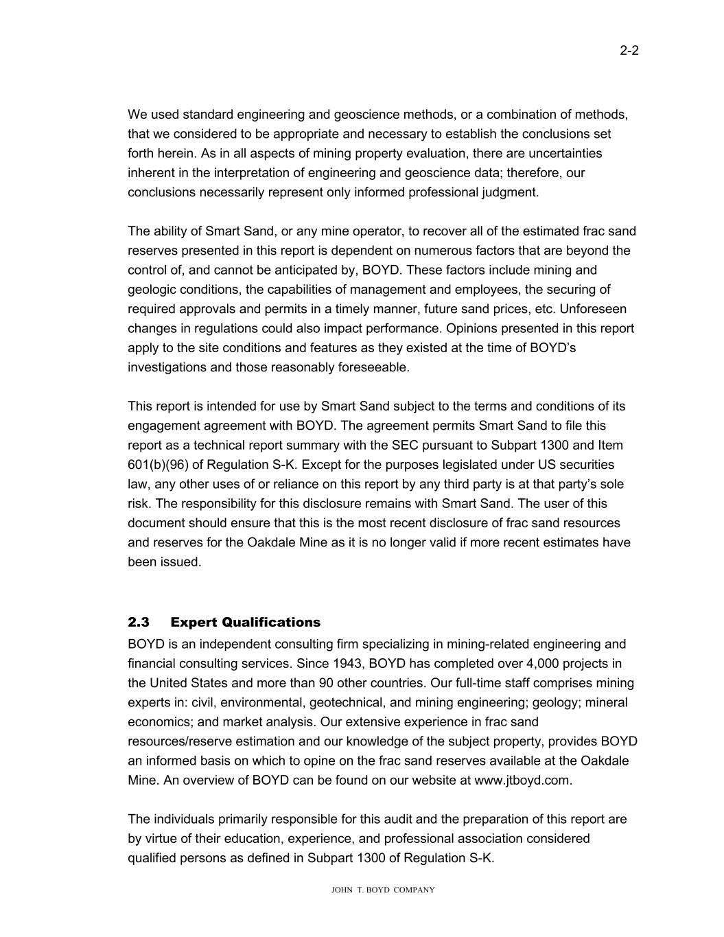 2-2 JOHN T. BOYD COMPANY We used standard engineering and geoscience methods, or a combination of methods, that we considered to be appropriate and necessary to establish the conclusions set forth herein. As in all aspects of mining property evaluation, there are uncertainties inherent in the interpretation of engineering and geoscience data; therefore, our conclusions necessarily represent only informed professional judgment. The ability of Smart Sand, or any mine operator, to recover all of the estimated frac sand reserves presented in this report is dependent on numerous factors that are beyond the control of, and cannot be anticipated by, BOYD. These factors include mining and geologic conditions, the capabilities of management and employees, the securing of required approvals and permits in a timely manner, future sand prices, etc. Unforeseen changes in regulations could also impact performance. Opinions presented in this report apply to the site conditions and features as they existed at the time of BOYD’s investigations and those reasonably foreseeable. This report is intended for use by Smart Sand subject to the terms and conditions of its engagement agreement with BOYD. The agreement permits Smart Sand to file this report as a technical report summary with the SEC pursuant to Subpart 1300 and Item 601(b)(96) of Regulation S-K. Except for the purposes legislated under US securities law, any other uses of or reliance on this report by any third party is at that party’s sole risk. The responsibility for this disclosure remains with Smart Sand. The user of this document should ensure that this is the most recent disclosure of frac sand resources and reserves for the Oakdale Mine as it is no longer valid if more recent estimates have been issued. 2.3 Expert Qualifications BOYD is an independent consulting firm specializing in mining-related engineering and financial consulting services. Since 1943, BOYD has completed over 4,000 projects in the United States and more than 90 other countries. Our full-time staff comprises mining experts in: civil, environmental, geotechnical, and mining engineering; geology; mineral economics; and market analysis. Our extensive experience in frac sand resources/reserve estimation and our knowledge of the subject property, provides BOYD an informed basis on which to opine on the frac sand reserves available at the Oakdale Mine. An overview of BOYD can be found on our website at www.jtboyd.com. The individuals primarily responsible for this audit and the preparation of this report are by virtue of their education, experience, and professional association considered qualified persons as defined in Subpart 1300 of Regulation S-K.