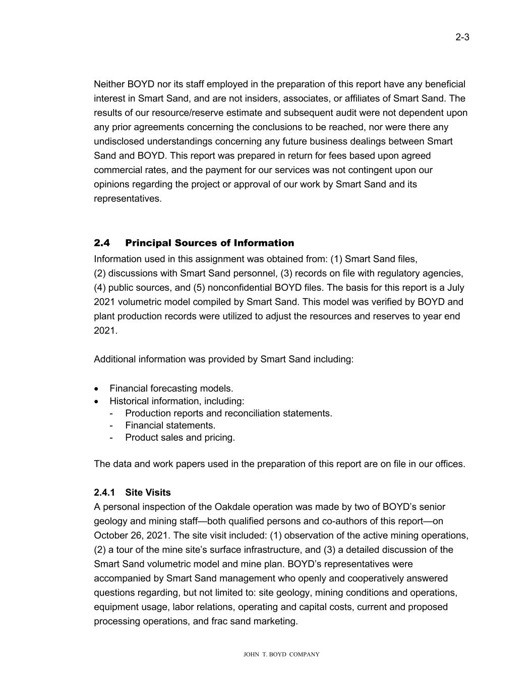 2-3 JOHN T. BOYD COMPANY Neither BOYD nor its staff employed in the preparation of this report have any beneficial interest in Smart Sand, and are not insiders, associates, or affiliates of Smart Sand. The results of our resource/reserve estimate and subsequent audit were not dependent upon any prior agreements concerning the conclusions to be reached, nor were there any undisclosed understandings concerning any future business dealings between Smart Sand and BOYD. This report was prepared in return for fees based upon agreed commercial rates, and the payment for our services was not contingent upon our opinions regarding the project or approval of our work by Smart Sand and its representatives. 2.4 Principal Sources of Information Information used in this assignment was obtained from: (1) Smart Sand files, (2) discussions with Smart Sand personnel, (3) records on file with regulatory agencies, (4) public sources, and (5) nonconfidential BOYD files. The basis for this report is a July 2021 volumetric model compiled by Smart Sand. This model was verified by BOYD and plant production records were utilized to adjust the resources and reserves to year end 2021. Additional information was provided by Smart Sand including: • Financial forecasting models. • Historical information, including: - Production reports and reconciliation statements. - Financial statements. - Product sales and pricing. The data and work papers used in the preparation of this report are on file in our offices. 2.4.1 Site Visits A personal inspection of the Oakdale operation was made by two of BOYD’s senior geology and mining staff—both qualified persons and co-authors of this report—on October 26, 2021. The site visit included: (1) observation of the active mining operations, (2) a tour of the mine site’s surface infrastructure, and (3) a detailed discussion of the Smart Sand volumetric model and mine plan. BOYD’s representatives were accompanied by Smart Sand management who openly and cooperatively answered questions regarding, but not limited to: site geology, mining conditions and operations, equipment usage, labor relations, operating and capital costs, current and proposed processing operations, and frac sand marketing.