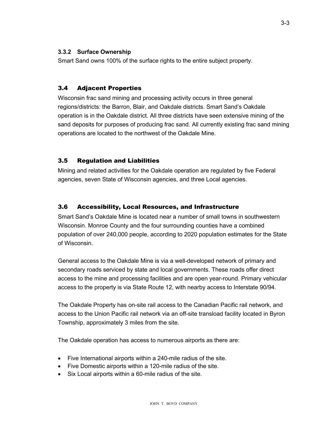 3-3 JOHN T. BOYD COMPANY 3.3.2 Surface Ownership Smart Sand owns 100% of the surface rights to the entire subject property. 3.4 Adjacent Properties Wisconsin frac sand mining and processing activity occurs in three general regions/districts: the Barron, Blair, and Oakdale districts. Smart Sand’s Oakdale operation is in the Oakdale district. All three districts have seen extensive mining of the sand deposits for purposes of producing frac sand. All currently existing frac sand mining operations are located to the northwest of the Oakdale Mine. 3.5 Regulation and Liabilities Mining and related activities for the Oakdale operation are regulated by five Federal agencies, seven State of Wisconsin agencies, and three Local agencies. 3.6 Accessibility, Local Resources, and Infrastructure Smart Sand’s Oakdale Mine is located near a number of small towns in southwestern Wisconsin. Monroe County and the four surrounding counties have a combined population of over 240,000 people, according to 2020 population estimates for the State of Wisconsin. General access to the Oakdale Mine is via a well-developed network of primary and secondary roads serviced by state and local governments. These roads offer direct access to the mine and processing facilities and are open year-round. Primary vehicular access to the property is via State Route 12, with nearby access to Interstate 90/94. The Oakdale Property has on-site rail access to the Canadian Pacific rail network, and access to the Union Pacific rail network via an off-site transload facility located in Byron Township, approximately 3 miles from the site. The Oakdale operation has access to numerous airports as there are: • Five International airports within a 240-mile radius of the site. • Five Domestic airports within a 120-mile radius of the site. • Six Local airports within a 60-mile radius of the site.