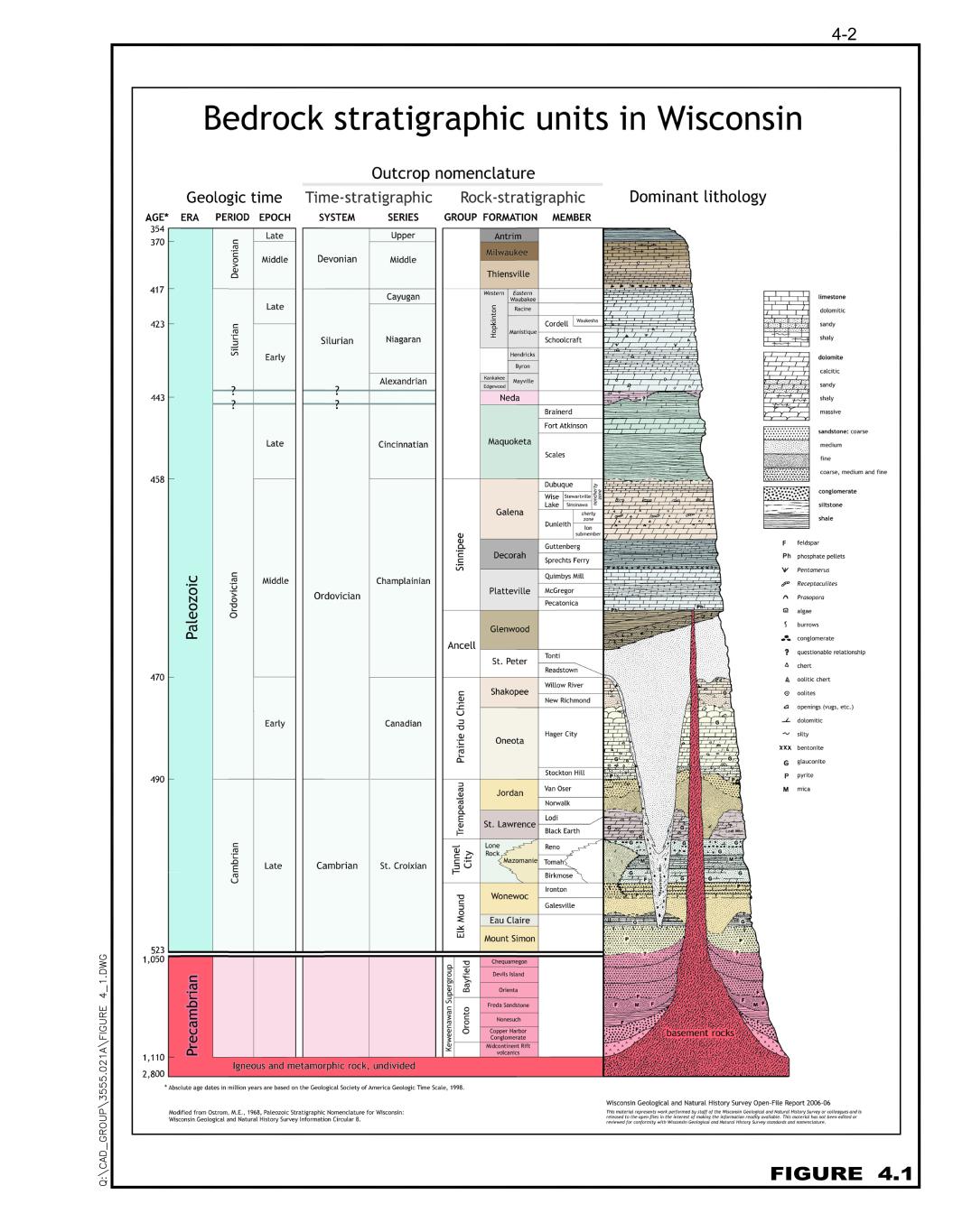 4-1 JOHN T. BOYD COMPANY 4.0 GEOLOGY 4.1 Regional Geology NWS are generally located in the north-central portion of the United States (predominantly in Minnesota, Wisconsin, and Illinois, with lesser amounts in Arkansas and Iowa). NWS is found in poorly cemented Cambrian and Ordovician sandstones and in unconsolidated alluvial deposits locally derived from these sandstones. The Saint Peter, Jordan, Wonewoc, and Mount Simon formations, located in south-central Minnesota into Wisconsin, are the primary sources of NWS, and can be observed in Figure 4.1, on the following page, which presents the various stratigraphic rock units in Wisconsin. The Oakdale Property is underlain by the Mount Simon Formation, which on a regional basis, ranges in thickness from 300 ft to over 2,000 ft (in Indiana). The Mount Simon sands can be described as poorly consolidated, poorly sorted, fine-grained, quartz sandstone. These sands are typically white in color, but can show a color change to a yellowish-gray or to a grayish-red. The Mount Simon Formation is of Cambrian age and underlying the Mount Simon is pre-Cambrian age granite. 4.2 Local Stratigraphy The surface of the Oakdale Property is overlain by a veneer of poorly sorted glacial till ranging from a few feet to over 30 ft in depth. Beneath the glacial till is the Mount Simon Formation. Within the property, the surface topography is predominately flat lying except for the western-southwestern portion of the property where the surface elevation increases as a series of hills or bluffs are present (vertical relief of 125 ft to 150 ft). The size consist of the sand found in the above drainage bluff areas is a coarser mix in comparison to the sands found in the alluvial material and in the in-place below drainage sand formations.