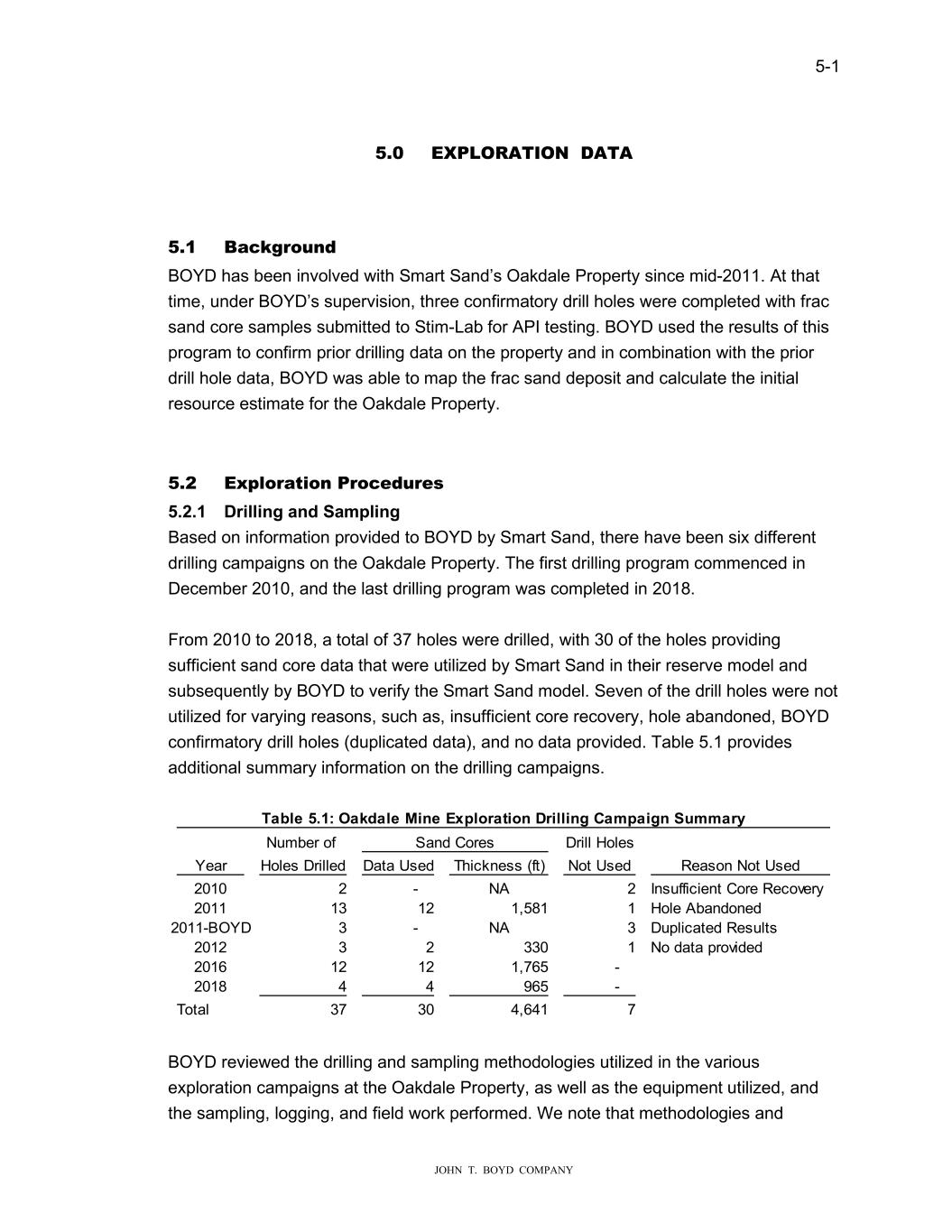 5-1 JOHN T. BOYD COMPANY 5.0 EXPLORATION DATA 5.1 Background BOYD has been involved with Smart Sand’s Oakdale Property since mid-2011. At that time, under BOYD’s supervision, three confirmatory drill holes were completed with frac sand core samples submitted to Stim-Lab for API testing. BOYD used the results of this program to confirm prior drilling data on the property and in combination with the prior drill hole data, BOYD was able to map the frac sand deposit and calculate the initial resource estimate for the Oakdale Property. 5.2 Exploration Procedures 5.2.1 Drilling and Sampling Based on information provided to BOYD by Smart Sand, there have been six different drilling campaigns on the Oakdale Property. The first drilling program commenced in December 2010, and the last drilling program was completed in 2018. From 2010 to 2018, a total of 37 holes were drilled, with 30 of the holes providing sufficient sand core data that were utilized by Smart Sand in their reserve model and subsequently by BOYD to verify the Smart Sand model. Seven of the drill holes were not utilized for varying reasons, such as, insufficient core recovery, hole abandoned, BOYD confirmatory drill holes (duplicated data), and no data provided. Table 5.1 provides additional summary information on the drilling campaigns. Number of Sand Cores Drill Holes Year Holes Drilled Data Used Thickness (ft) Not Used Reason Not Used 2010 2 - NA 2 Insufficient Core Recovery 2011 13 12 1,581 1 Hole Abandoned 2011-BOYD 3 - NA 3 Duplicated Results 2012 3 2 330 1 No data provided 2016 12 12 1,765 - 2018 4 4 965 - Total 37 30 4,641 7 Table 5.1: Oakdale Mine Exploration Drilling Campaign Summary BOYD reviewed the drilling and sampling methodologies utilized in the various exploration campaigns at the Oakdale Property, as well as the equipment utilized, and the sampling, logging, and field work performed. We note that methodologies and