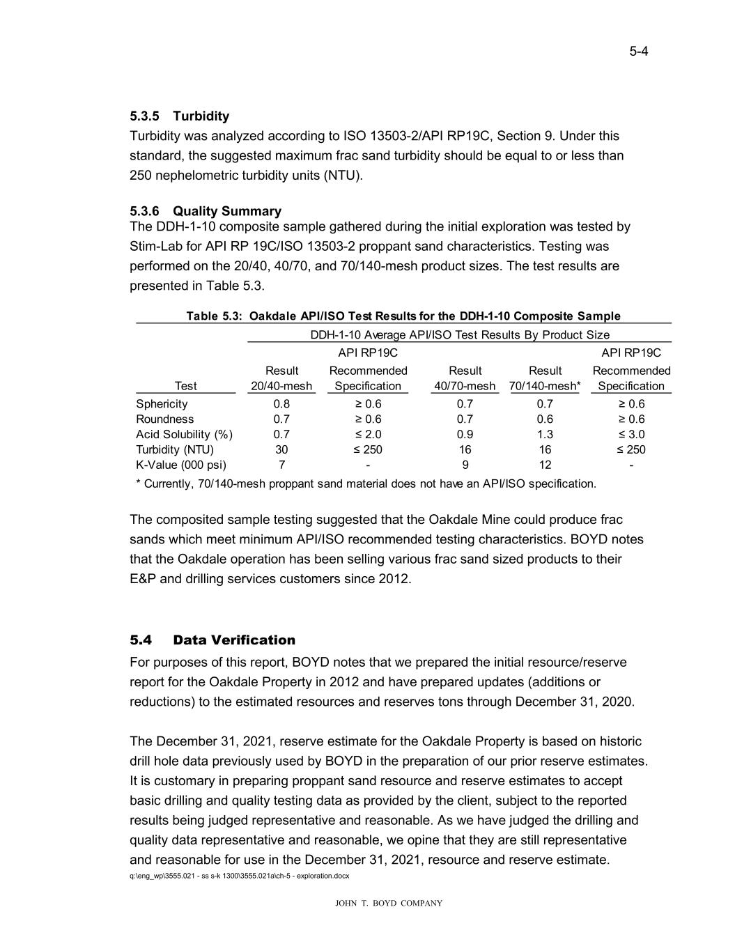 5-4 JOHN T. BOYD COMPANY 5.3.5 Turbidity Turbidity was analyzed according to ISO 13503-2/API RP19C, Section 9. Under this standard, the suggested maximum frac sand turbidity should be equal to or less than 250 nephelometric turbidity units (NTU). 5.3.6 Quality Summary The DDH-1-10 composite sample gathered during the initial exploration was tested by Stim-Lab for API RP 19C/ISO 13503-2 proppant sand characteristics. Testing was performed on the 20/40, 40/70, and 70/140-mesh product sizes. The test results are presented in Table 5.3. DDH-1-10 Average API/ISO Test Results By Product Size API RP19C API RP19C Result Recommended Result Result Recommended Test 20/40-mesh Specification 40/70-mesh 70/140-mesh* Specification Sphericity 0.8 ≥ 0.6 0.7 0.7 ≥ 0.6 Roundness 0.7 ≥ 0.6 0.7 0.6 ≥ 0.6 Acid Solubility (%) 0.7 ≤ 2.0 0.9 1.3 ≤ 3.0 Turbidity (NTU) 30 ≤ 250 16 16 ≤ 250 K-Value (000 psi) 7 - 9 12 - * Currently, 70/140-mesh proppant sand material does not have an API/ISO specification. Table 5.3: Oakdale API/ISO Test Results for the DDH-1-10 Composite Sample The composited sample testing suggested that the Oakdale Mine could produce frac sands which meet minimum API/ISO recommended testing characteristics. BOYD notes that the Oakdale operation has been selling various frac sand sized products to their E&P and drilling services customers since 2012. 5.4 Data Verification For purposes of this report, BOYD notes that we prepared the initial resource/reserve report for the Oakdale Property in 2012 and have prepared updates (additions or reductions) to the estimated resources and reserves tons through December 31, 2020. The December 31, 2021, reserve estimate for the Oakdale Property is based on historic drill hole data previously used by BOYD in the preparation of our prior reserve estimates. It is customary in preparing proppant sand resource and reserve estimates to accept basic drilling and quality testing data as provided by the client, subject to the reported results being judged representative and reasonable. As we have judged the drilling and quality data representative and reasonable, we opine that they are still representative and reasonable for use in the December 31, 2021, resource and reserve estimate. q:\eng_wp\3555.021 - ss s-k 1300\3555.021a\ch-5 - exploration.docx