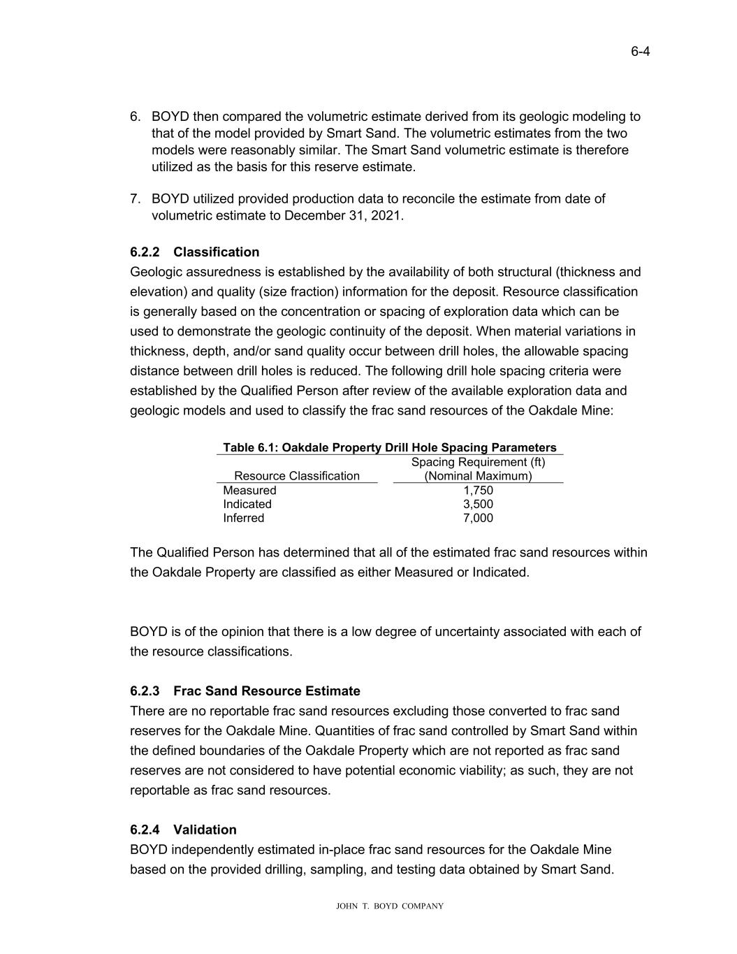 6-4 JOHN T. BOYD COMPANY 6. BOYD then compared the volumetric estimate derived from its geologic modeling to that of the model provided by Smart Sand. The volumetric estimates from the two models were reasonably similar. The Smart Sand volumetric estimate is therefore utilized as the basis for this reserve estimate. 7. BOYD utilized provided production data to reconcile the estimate from date of volumetric estimate to December 31, 2021. 6.2.2 Classification Geologic assuredness is established by the availability of both structural (thickness and elevation) and quality (size fraction) information for the deposit. Resource classification is generally based on the concentration or spacing of exploration data which can be used to demonstrate the geologic continuity of the deposit. When material variations in thickness, depth, and/or sand quality occur between drill holes, the allowable spacing distance between drill holes is reduced. The following drill hole spacing criteria were established by the Qualified Person after review of the available exploration data and geologic models and used to classify the frac sand resources of the Oakdale Mine: Table 6.1: Oakdale Property Drill Hole Spacing Parameters Resource Classification Spacing Requirement (ft) (Nominal Maximum) Measured 1,750 Indicated 3,500 Inferred 7,000 The Qualified Person has determined that all of the estimated frac sand resources within the Oakdale Property are classified as either Measured or Indicated. BOYD is of the opinion that there is a low degree of uncertainty associated with each of the resource classifications. 6.2.3 Frac Sand Resource Estimate There are no reportable frac sand resources excluding those converted to frac sand reserves for the Oakdale Mine. Quantities of frac sand controlled by Smart Sand within the defined boundaries of the Oakdale Property which are not reported as frac sand reserves are not considered to have potential economic viability; as such, they are not reportable as frac sand resources. 6.2.4 Validation BOYD independently estimated in-place frac sand resources for the Oakdale Mine based on the provided drilling, sampling, and testing data obtained by Smart Sand.