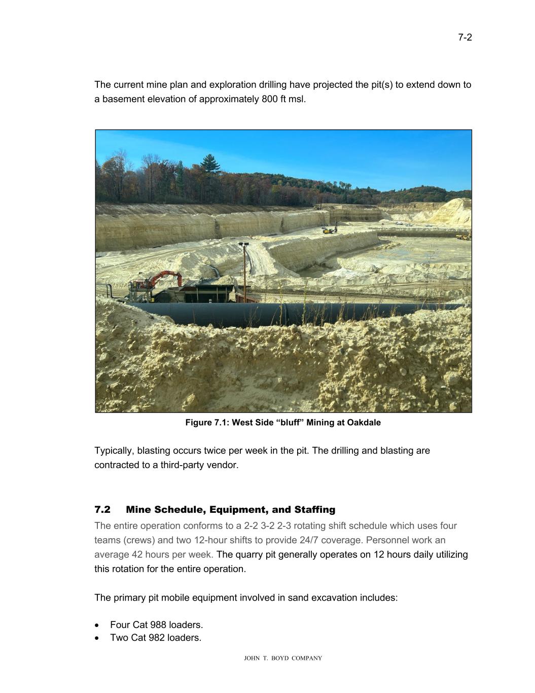 7-2 JOHN T. BOYD COMPANY The current mine plan and exploration drilling have projected the pit(s) to extend down to a basement elevation of approximately 800 ft msl. Figure 7.1: West Side “bluff” Mining at Oakdale Typically, blasting occurs twice per week in the pit. The drilling and blasting are contracted to a third-party vendor. 7.2 Mine Schedule, Equipment, and Staffing The entire operation conforms to a 2-2 3-2 2-3 rotating shift schedule which uses four teams (crews) and two 12-hour shifts to provide 24/7 coverage. Personnel work an average 42 hours per week. The quarry pit generally operates on 12 hours daily utilizing this rotation for the entire operation. The primary pit mobile equipment involved in sand excavation includes: • Four Cat 988 loaders. • Two Cat 982 loaders.