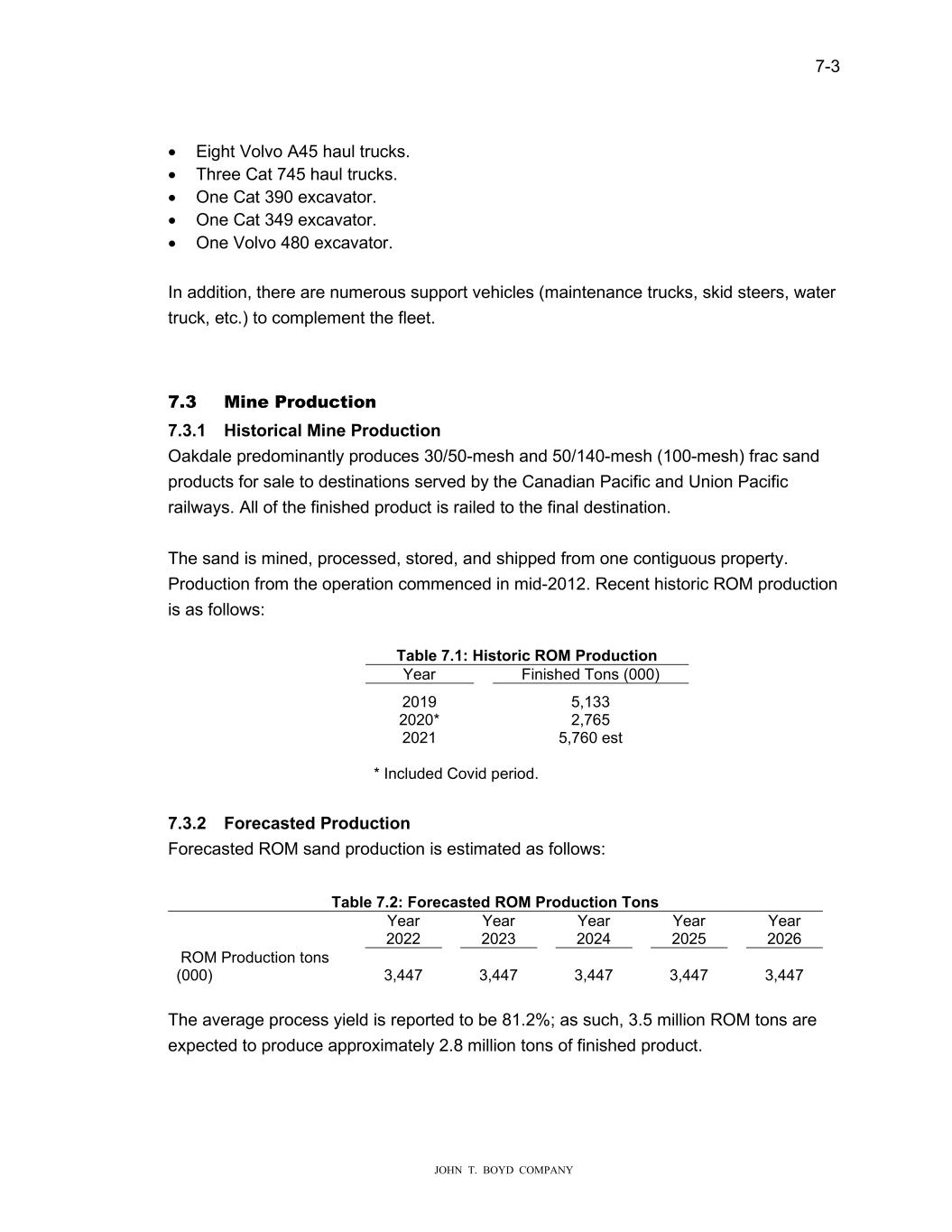7-3 JOHN T. BOYD COMPANY • Eight Volvo A45 haul trucks. • Three Cat 745 haul trucks. • One Cat 390 excavator. • One Cat 349 excavator. • One Volvo 480 excavator. In addition, there are numerous support vehicles (maintenance trucks, skid steers, water truck, etc.) to complement the fleet. 7.3 Mine Production 7.3.1 Historical Mine Production Oakdale predominantly produces 30/50-mesh and 50/140-mesh (100-mesh) frac sand products for sale to destinations served by the Canadian Pacific and Union Pacific railways. All of the finished product is railed to the final destination. The sand is mined, processed, stored, and shipped from one contiguous property. Production from the operation commenced in mid-2012. Recent historic ROM production is as follows: Table 7.1: Historic ROM Production Year Finished Tons (000) 2019 5,133 2020* 2,765 2021 5,760 est * Included Covid period. 7.3.2 Forecasted Production Forecasted ROM sand production is estimated as follows: Table 7.2: Forecasted ROM Production Tons Year 2022 Year 2023 Year 2024 Year 2025 Year 2026 ROM Production tons (000) 3,447 3,447 3,447 3,447 3,447 The average process yield is reported to be 81.2%; as such, 3.5 million ROM tons are expected to produce approximately 2.8 million tons of finished product.