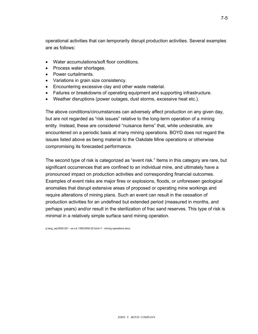 7-5 JOHN T. BOYD COMPANY operational activities that can temporarily disrupt production activities. Several examples are as follows: • Water accumulations/soft floor conditions. • Process water shortages. • Power curtailments. • Variations in grain size consistency. • Encountering excessive clay and other waste material. • Failures or breakdowns of operating equipment and supporting infrastructure. • Weather disruptions (power outages, dust storms, excessive heat etc.). The above conditions/circumstances can adversely affect production on any given day, but are not regarded as “risk issues” relative to the long-term operation of a mining entity. Instead, these are considered “nuisance items” that, while undesirable, are encountered on a periodic basis at many mining operations. BOYD does not regard the issues listed above as being material to the Oakdale Mine operations or otherwise compromising its forecasted performance. The second type of risk is categorized as “event risk.” Items in this category are rare, but significant occurrences that are confined to an individual mine, and ultimately have a pronounced impact on production activities and corresponding financial outcomes. Examples of event risks are major fires or explosions, floods, or unforeseen geological anomalies that disrupt extensive areas of proposed or operating mine workings and require alterations of mining plans. Such an event can result in the cessation of production activities for an undefined but extended period (measured in months, and perhaps years) and/or result in the sterilization of frac sand reserves. This type of risk is minimal in a relatively simple surface sand mining operation. q:\eng_wp\3555.021 - ss s-k 1300\3555.021a\ch-7 - mining operations.docx