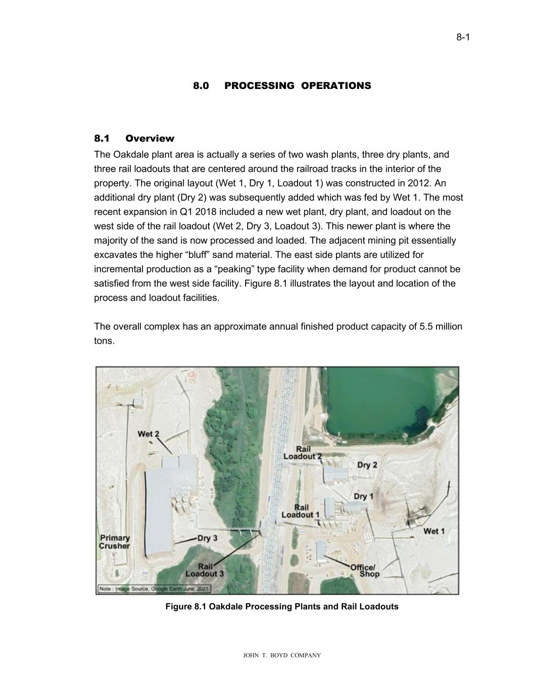 8-1 JOHN T. BOYD COMPANY 8.0 PROCESSING OPERATIONS 8.1 Overview The Oakdale plant area is actually a series of two wash plants, three dry plants, and three rail loadouts that are centered around the railroad tracks in the interior of the property. The original layout (Wet 1, Dry 1, Loadout 1) was constructed in 2012. An additional dry plant (Dry 2) was subsequently added which was fed by Wet 1. The most recent expansion in Q1 2018 included a new wet plant, dry plant, and loadout on the west side of the rail loadout (Wet 2, Dry 3, Loadout 3). This newer plant is where the majority of the sand is now processed and loaded. The adjacent mining pit essentially excavates the higher “bluff” sand material. The east side plants are utilized for incremental production as a “peaking” type facility when demand for product cannot be satisfied from the west side facility. Figure 8.1 illustrates the layout and location of the process and loadout facilities. The overall complex has an approximate annual finished product capacity of 5.5 million tons. Figure 8.1 Oakdale Processing Plants and Rail Loadouts