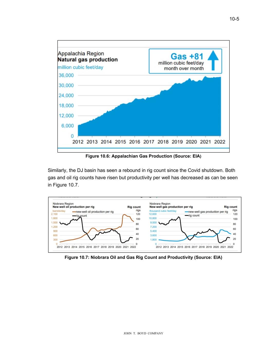 10-5 JOHN T. BOYD COMPANY Figure 10.6: Appalachian Gas Production (Source: EIA) Similarly, the DJ basin has seen a rebound in rig count since the Covid shutdown. Both gas and oil rig counts have risen but productivity per well has decreased as can be seen in Figure 10.7. Figure 10.7: Niobrara Oil and Gas Rig Count and Productivity (Source: EIA)