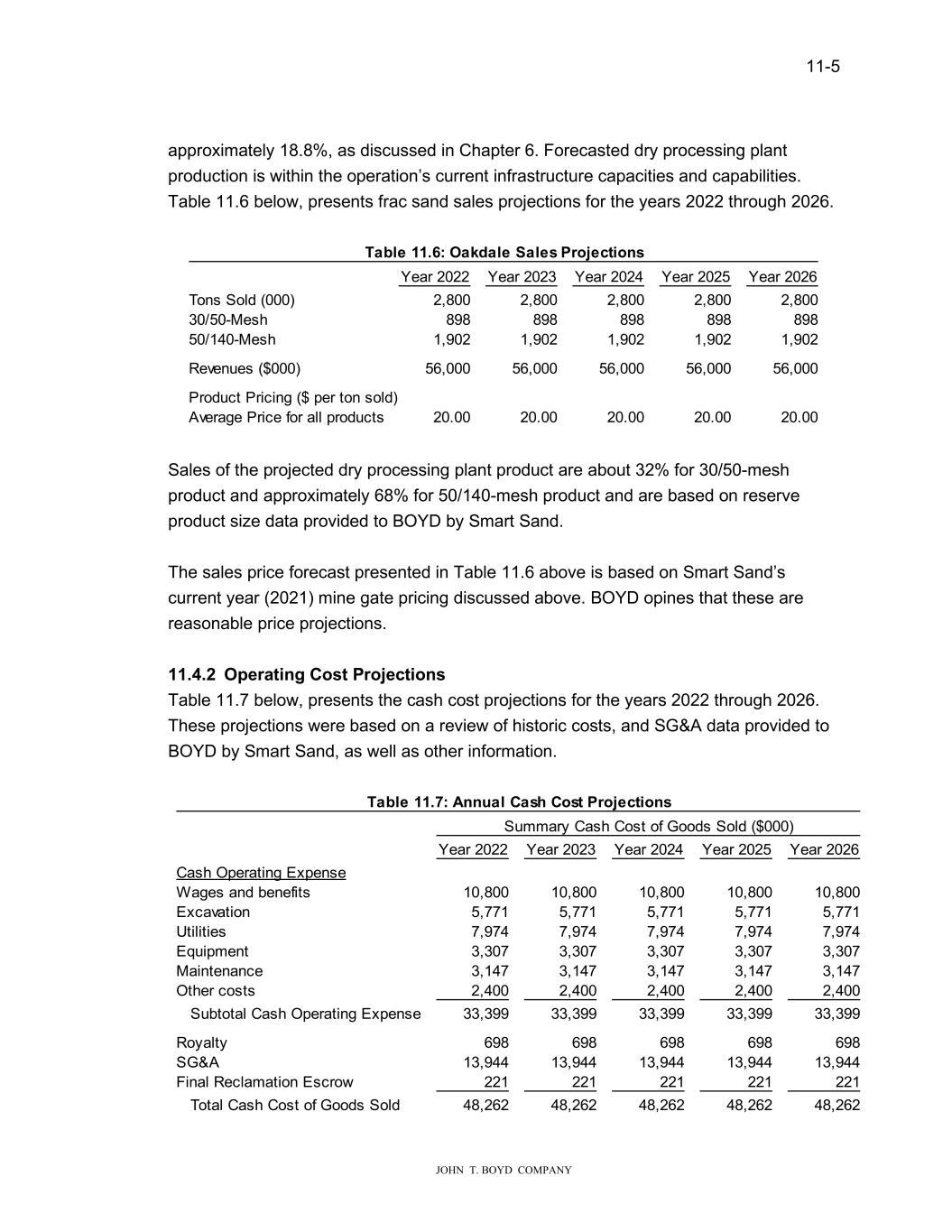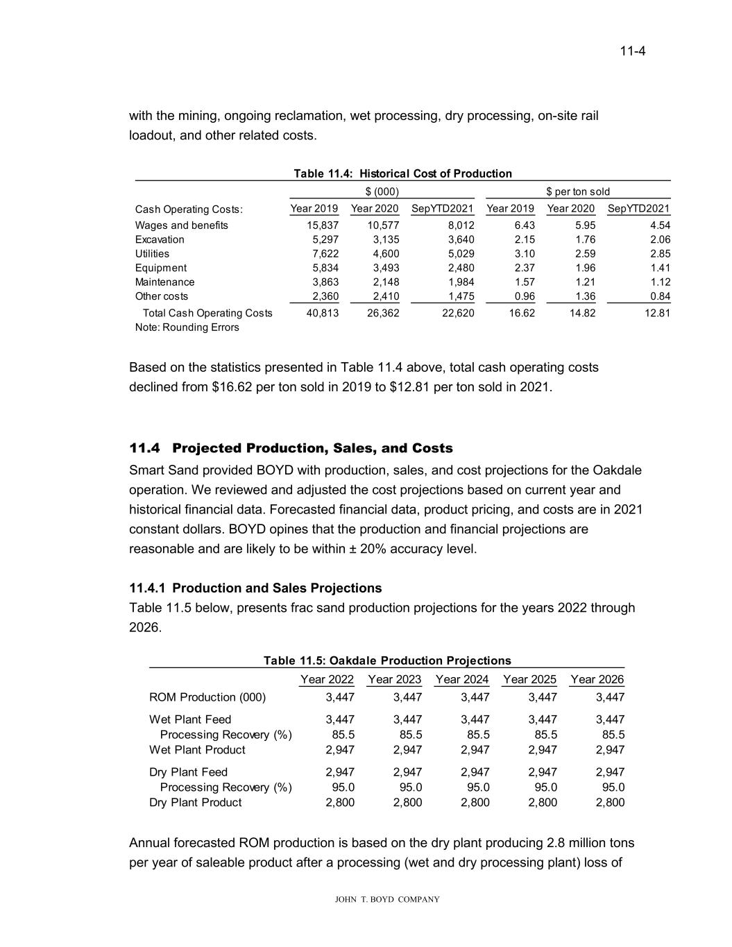 11-4 JOHN T. BOYD COMPANY with the mining, ongoing reclamation, wet processing, dry processing, on-site rail loadout, and other related costs. $ (000) $ per ton sold Cash Operating Costs: Year 2019 Year 2020 SepYTD2021 Year 2019 Year 2020 SepYTD2021 Wages and benefits 15,837 10,577 8,012 6.43 5.95 4.54 Excavation 5,297 3,135 3,640 2.15 1.76 2.06 Utilities 7,622 4,600 5,029 3.10 2.59 2.85 Equipment 5,834 3,493 2,480 2.37 1.96 1.41 Maintenance 3,863 2,148 1,984 1.57 1.21 1.12 Other costs 2,360 2,410 1,475 0.96 1.36 0.84 Total Cash Operating Costs 40,813 26,362 22,620 16.62 14.82 12.81 Note: Rounding Errors Table 11.4: Historical Cost of Production Based on the statistics presented in Table 11.4 above, total cash operating costs declined from $16.62 per ton sold in 2019 to $12.81 per ton sold in 2021. 11.4 Projected Production, Sales, and Costs Smart Sand provided BOYD with production, sales, and cost projections for the Oakdale operation. We reviewed and adjusted the cost projections based on current year and historical financial data. Forecasted financial data, product pricing, and costs are in 2021 constant dollars. BOYD opines that the production and financial projections are reasonable and are likely to be within ± 20% accuracy level. 11.4.1 Production and Sales Projections Table 11.5 below, presents frac sand production projections for the years 2022 through 2026. Year 2022 Year 2023 Year 2024 Year 2025 Year 2026 ROM Production (000) 3,447 3,447 3,447 3,447 3,447 Wet Plant Feed 3,447 3,447 3,447 3,447 3,447 Processing Recovery (%) 85.5 85.5 85.5 85.5 85.5 Wet Plant Product 2,947 2,947 2,947 2,947 2,947 Dry Plant Feed 2,947 2,947 2,947 2,947 2,947 Processing Recovery (%) 95.0 95.0 95.0 95.0 95.0 Dry Plant Product 2,800 2,800 2,800 2,800 2,800 Table 11.5: Oakdale Production Projections Annual forecasted ROM production is based on the dry plant producing 2.8 million tons per year of saleable product after a processing (wet and dry processing plant) loss of