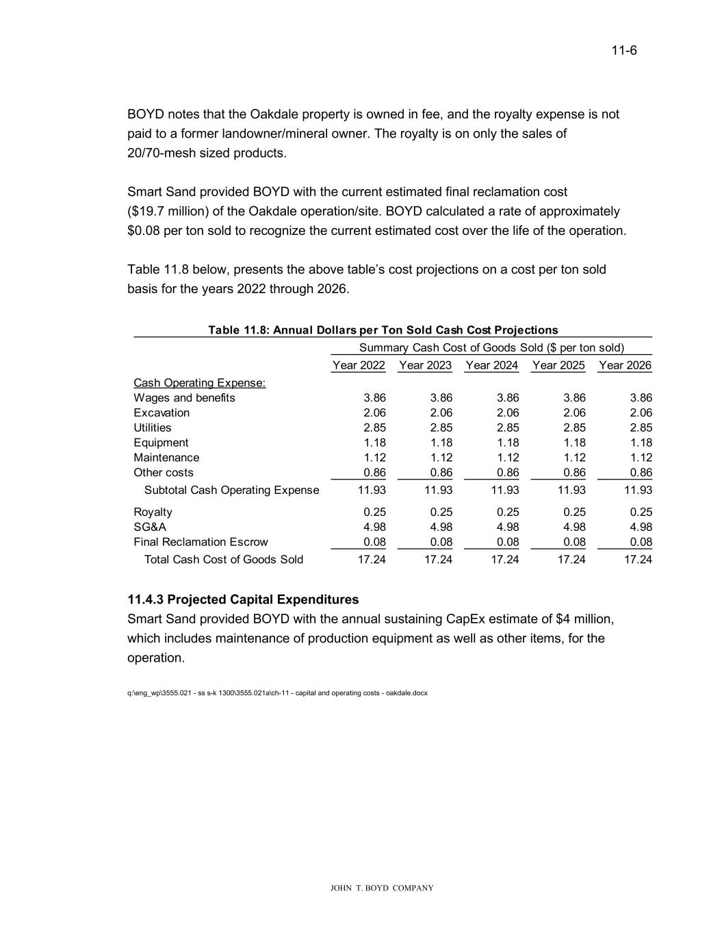 11-6 JOHN T. BOYD COMPANY BOYD notes that the Oakdale property is owned in fee, and the royalty expense is not paid to a former landowner/mineral owner. The royalty is on only the sales of 20/70-mesh sized products. Smart Sand provided BOYD with the current estimated final reclamation cost ($19.7 million) of the Oakdale operation/site. BOYD calculated a rate of approximately $0.08 per ton sold to recognize the current estimated cost over the life of the operation. Table 11.8 below, presents the above table’s cost projections on a cost per ton sold basis for the years 2022 through 2026. Summary Cash Cost of Goods Sold ($ per ton sold) Year 2022 Year 2023 Year 2024 Year 2025 Year 2026 Cash Operating Expense: Wages and benefits 3.86 3.86 3.86 3.86 3.86 Excavation 2.06 2.06 2.06 2.06 2.06 Utilities 2.85 2.85 2.85 2.85 2.85 Equipment 1.18 1.18 1.18 1.18 1.18 Maintenance 1.12 1.12 1.12 1.12 1.12 Other costs 0.86 0.86 0.86 0.86 0.86 Subtotal Cash Operating Expense 11.93 11.93 11.93 11.93 11.93 Royalty 0.25 0.25 0.25 0.25 0.25 SG&A 4.98 4.98 4.98 4.98 4.98 Final Reclamation Escrow 0.08 0.08 0.08 0.08 0.08 Total Cash Cost of Goods Sold 17.24 17.24 17.24 17.24 17.24 Table 11.8: Annual Dollars per Ton Sold Cash Cost Projections 11.4.3 Projected Capital Expenditures Smart Sand provided BOYD with the annual sustaining CapEx estimate of $4 million, which includes maintenance of production equipment as well as other items, for the operation. q:\eng_wp\3555.021 - ss s-k 1300\3555.021a\ch-11 - capital and operating costs - oakdale.docx
