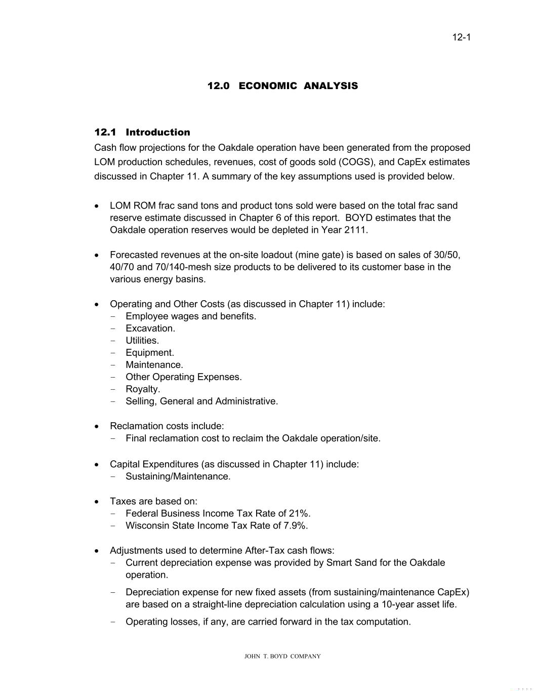 12-1 JOHN T. BOYD COMPANY 12.0 ECONOMIC ANALYSIS 12.1 Introduction Cash flow projections for the Oakdale operation have been generated from the proposed LOM production schedules, revenues, cost of goods sold (COGS), and CapEx estimates discussed in Chapter 11. A summary of the key assumptions used is provided below. • LOM ROM frac sand tons and product tons sold were based on the total frac sand reserve estimate discussed in Chapter 6 of this report. BOYD estimates that the Oakdale operation reserves would be depleted in Year 2111. • Forecasted revenues at the on-site loadout (mine gate) is based on sales of 30/50, 40/70 and 70/140-mesh size products to be delivered to its customer base in the various energy basins. • Operating and Other Costs (as discussed in Chapter 11) include: − Employee wages and benefits. − Excavation. − Utilities. − Equipment. − Maintenance. − Other Operating Expenses. − Royalty. − Selling, General and Administrative. • Reclamation costs include: − Final reclamation cost to reclaim the Oakdale operation/site. • Capital Expenditures (as discussed in Chapter 11) include: − Sustaining/Maintenance. • Taxes are based on: − Federal Business Income Tax Rate of 21%. − Wisconsin State Income Tax Rate of 7.9%. • Adjustments used to determine After-Tax cash flows: − Current depreciation expense was provided by Smart Sand for the Oakdale operation. − Depreciation expense for new fixed assets (from sustaining/maintenance CapEx) are based on a straight-line depreciation calculation using a 10-year asset life. − Operating losses, if any, are carried forward in the tax computation.