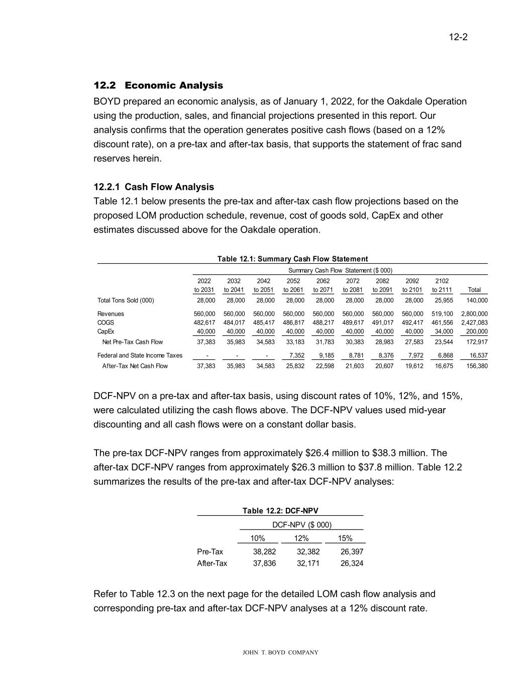 12-2 JOHN T. BOYD COMPANY 12.2 Economic Analysis BOYD prepared an economic analysis, as of January 1, 2022, for the Oakdale Operation using the production, sales, and financial projections presented in this report. Our analysis confirms that the operation generates positive cash flows (based on a 12% discount rate), on a pre-tax and after-tax basis, that supports the statement of frac sand reserves herein. 12.2.1 Cash Flow Analysis Table 12.1 below presents the pre-tax and after-tax cash flow projections based on the proposed LOM production schedule, revenue, cost of goods sold, CapEx and other estimates discussed above for the Oakdale operation. Summary Cash Flow Statement ($ 000) 2022 2032 2042 2052 2062 2072 2082 2092 2102 to 2031 to 2041 to 2051 to 2061 to 2071 to 2081 to 2091 to 2101 to 2111 Total Total Tons Sold (000) 28,000 28,000 28,000 28,000 28,000 28,000 28,000 28,000 25,955 140,000 Revenues 560,000 560,000 560,000 560,000 560,000 560,000 560,000 560,000 519,100 2,800,000 COGS 482,617 484,017 485,417 486,817 488,217 489,617 491,017 492,417 461,556 2,427,083 CapEx 40,000 40,000 40,000 40,000 40,000 40,000 40,000 40,000 34,000 200,000 Net Pre-Tax Cash Flow 37,383 35,983 34,583 33,183 31,783 30,383 28,983 27,583 23,544 172,917 Federal and State Income Taxes - - - 7,352 9,185 8,781 8,376 7,972 6,868 16,537 After-Tax Net Cash Flow 37,383 35,983 34,583 25,832 22,598 21,603 20,607 19,612 16,675 156,380 Table 12.1: Summary Cash Flow Statement DCF-NPV on a pre-tax and after-tax basis, using discount rates of 10%, 12%, and 15%, were calculated utilizing the cash flows above. The DCF-NPV values used mid-year discounting and all cash flows were on a constant dollar basis. The pre-tax DCF-NPV ranges from approximately $26.4 million to $38.3 million. The after-tax DCF-NPV ranges from approximately $26.3 million to $37.8 million. Table 12.2 summarizes the results of the pre-tax and after-tax DCF-NPV analyses: DCF-NPV ($ 000) 10% 12% 15% Pre-Tax 38,282 32,382 26,397 After-Tax 37,836 32,171 26,324 Table 12.2: DCF-NPV Refer to Table 12.3 on the next page for the detailed LOM cash flow analysis and corresponding pre-tax and after-tax DCF-NPV analyses at a 12% discount rate.