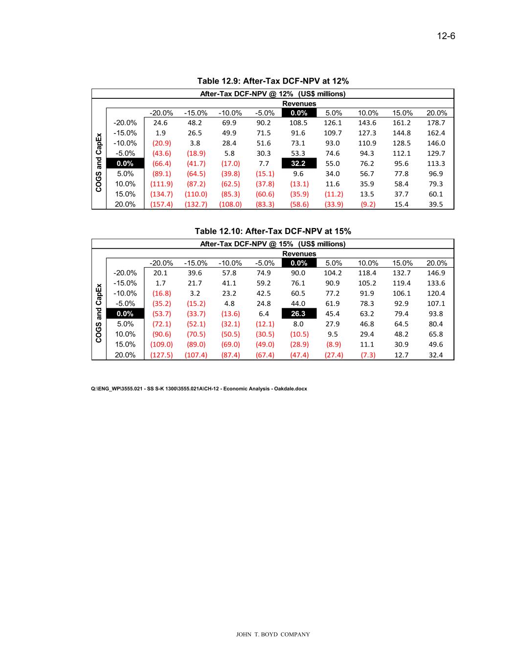 12-5 JOHN T. BOYD COMPANY Table 12.6: Pre-Tax DCF-NPV at 12% Pre-Tax DCF-NPV @ 12% (US$ millions) -20.0% -15.0% -10.0% -5.0% 0.0% 5.0% 10.0% 15.0% 20.0% -20.0% 24.6 49.3 74.0 98.7 123.4 148.1 172.8 197.5 222.2 -15.0% 1.9 26.6 51.3 76.0 100.6 125.3 150.0 174.7 199.4 -10.0% (20.9) 3.8 28.5 53.2 77.9 102.6 127.3 152.0 176.7 -5.0% (43.6) (18.9) 5.8 30.4 55.1 79.8 104.5 129.2 153.9 0.0% (66.4) (41.7) (17.0) 7.7 32.4 57.1 81.8 106.5 131.2 5.0% (89.1) (64.5) (39.8) (15.1) 9.6 34.3 59.0 83.7 108.4 10.0% (111.9) (87.2) (62.5) (37.8) (13.1) 11.6 36.3 61.0 85.6 15.0% (134.7) (110.0) (85.3) (60.6) (35.9) (11.2) 13.5 38.2 62.9 20.0% (157.4) (132.7) (108.0) (83.3) (58.6) (33.9) (9.2) 15.4 40.1 Revenues CO G S an d Ca pE x Table 12.7: Pre-Tax DCF-NPV at 15% Pre-Tax DCF-NPV @ 15% (US$ millions) -20.0% -15.0% -10.0% -5.0% 0.0% 5.0% 10.0% 15.0% 20.0% -20.0% 20.1 40.1 60.1 80.2 100.2 120.2 140.2 160.2 180.2 -15.0% 1.7 21.7 41.7 61.7 81.7 101.8 121.8 141.8 161.8 -10.0% (16.8) 3.2 23.3 43.3 63.3 83.3 103.3 123.3 143.4 -5.0% (35.2) (15.2) 4.8 24.8 44.8 64.9 84.9 104.9 124.9 0.0% (53.7) (33.7) (13.6) 6.4 26.4 46.4 66.4 86.5 106.5 5.0% (72.1) (52.1) (32.1) (12.1) 8.0 28.0 48.0 68.0 88.0 10.0% (90.6) (70.5) (50.5) (30.5) (10.5) 9.5 29.5 49.6 69.6 15.0% (109.0) (89.0) (69.0) (49.0) (28.9) (8.9) 11.1 31.1 51.1 20.0% (127.5) (107.4) (87.4) (67.4) (47.4) (27.4) (7.3) 12.7 32.7 Revenues CO G S an d Ca pE x 12.2.2.2 After-Tax Sensitivity Analyses The following three tables (Tables 12.8–12.10) summarize the results of the after-tax sensitivity analyses performed, which utilize discount rates of 10%, 12%, and 15% and incorporate the changes to revenues and COGS/CapEx discussed above: Table 12.8: After-Tax DCF-NPV at 10% After-Tax DCF-NPV @ 10% (US$ millions) -20.0% -15.0% -10.0% -5.0% 0.0% 5.0% 10.0% 15.0% 20.0% -20.0% 29.0 56.4 81.4 104.9 126.5 147.4 168.2 189.1 210.0 -15.0% 2.0 31.2 58.4 83.3 106.6 128.0 148.8 169.7 190.6 -10.0% (25.1) 4.3 33.5 60.4 85.1 108.2 129.4 150.3 171.2 -5.0% (52.1) (22.8) 6.6 35.7 62.4 86.9 109.8 130.9 151.8 0.0% (79.2) (49.8) (20.4) 8.9 37.9 64.3 88.7 111.4 132.4 5.0% (106.2) (76.9) (47.5) (18.1) 11.2 40.0 66.3 90.5 112.9 10.0% (133.3) (103.9) (74.5) (45.2) (15.8) 13.5 42.2 68.2 92.3 15.0% (160.3) (130.9) (101.6) (72.2) (42.9) (13.5) 15.9 44.3 70.1 20.0% (187.4) (158.0) (128.6) (99.3) (69.9) (40.6) (11.2) 18.2 46.4 Revenues CO G S an d Ca pE x