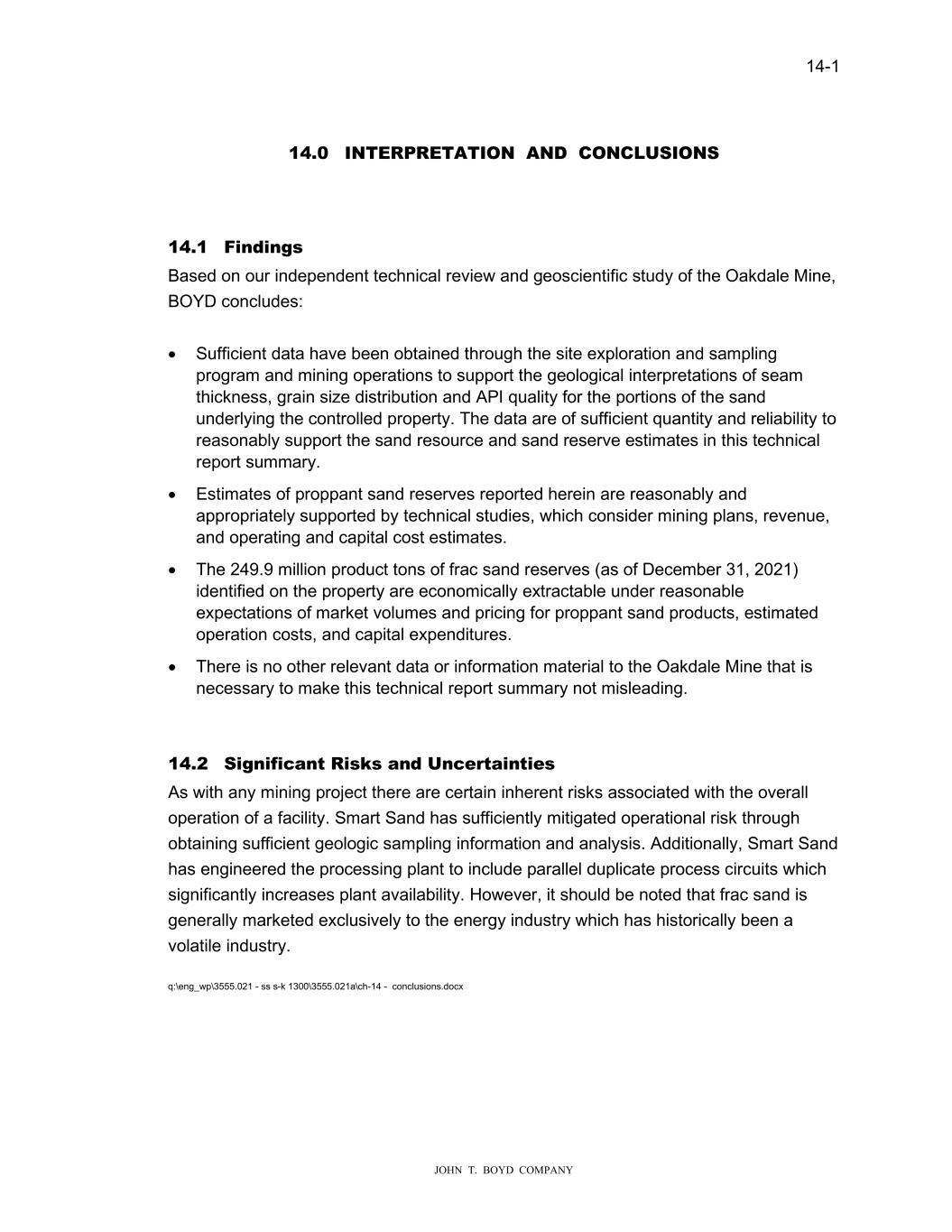 14-1 JOHN T. BOYD COMPANY 14.0 INTERPRETATION AND CONCLUSIONS 14.1 Findings Based on our independent technical review and geoscientific study of the Oakdale Mine, BOYD concludes: • Sufficient data have been obtained through the site exploration and sampling program and mining operations to support the geological interpretations of seam thickness, grain size distribution and API quality for the portions of the sand underlying the controlled property. The data are of sufficient quantity and reliability to reasonably support the sand resource and sand reserve estimates in this technical report summary. • Estimates of proppant sand reserves reported herein are reasonably and appropriately supported by technical studies, which consider mining plans, revenue, and operating and capital cost estimates. • The 249.9 million product tons of frac sand reserves (as of December 31, 2021) identified on the property are economically extractable under reasonable expectations of market volumes and pricing for proppant sand products, estimated operation costs, and capital expenditures. • There is no other relevant data or information material to the Oakdale Mine that is necessary to make this technical report summary not misleading. 14.2 Significant Risks and Uncertainties As with any mining project there are certain inherent risks associated with the overall operation of a facility. Smart Sand has sufficiently mitigated operational risk through obtaining sufficient geologic sampling information and analysis. Additionally, Smart Sand has engineered the processing plant to include parallel duplicate process circuits which significantly increases plant availability. However, it should be noted that frac sand is generally marketed exclusively to the energy industry which has historically been a volatile industry. q:\eng_wp\3555.021 - ss s-k 1300\3555.021a\ch-14 - conclusions.docx