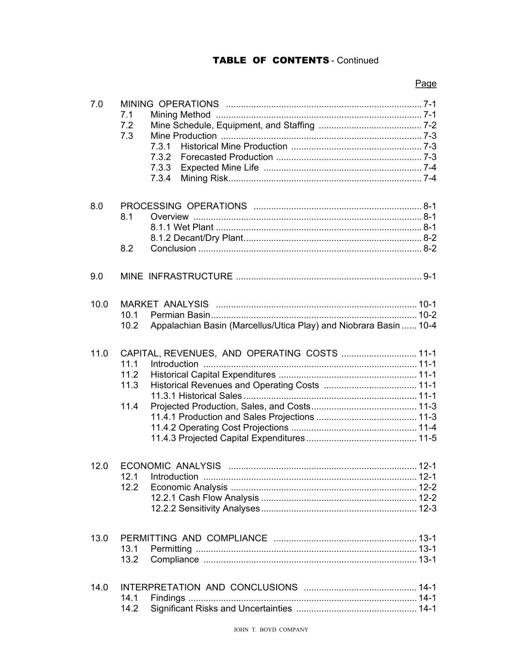 TABLE OF CONTENTS - Continued Page JOHN T. BOYD COMPANY 7.0 MINING OPERATIONS .............................................................................. 7-1 7.1 Mining Method .................................................................................. 7-1 7.2 Mine Schedule, Equipment, and Staffing ......................................... 7-2 7.3 Mine Production ................................................................................ 7-3 7.3.1 Historical Mine Production .................................................... 7-3 7.3.2 Forecasted Production .......................................................... 7-3 7.3.3 Expected Mine Life ............................................................... 7-4 7.3.4 Mining Risk ............................................................................. 7-4 8.0 PROCESSING OPERATIONS ................................................................... 8-1 8.1 Overview ........................................................................................... 8-1 8.1.1 Wet Plant .................................................................................. 8-1 8.1.2 Decant/Dry Plant ....................................................................... 8-2 8.2 Conclusion ......................................................................................... 8-2 9.0 MINE INFRASTRUCTURE .......................................................................... 9-1 10.0 MARKET ANALYSIS ................................................................................ 10-1 10.1 Permian Basin .................................................................................. 10-2 10.2 Appalachian Basin (Marcellus/Utica Play) and Niobrara Basin ...... 10-4 11.0 CAPITAL, REVENUES, AND OPERATING COSTS .............................. 11-1 11.1 Introduction ..................................................................................... 11-1 11.2 Historical Capital Expenditures ....................................................... 11-1 11.3 Historical Revenues and Operating Costs ..................................... 11-1 11.3.1 Historical Sales ..................................................................... 11-1 11.4 Projected Production, Sales, and Costs .......................................... 11-3 11.4.1 Production and Sales Projections ........................................ 11-3 11.4.2 Operating Cost Projections .................................................. 11-4 11.4.3 Projected Capital Expenditures ............................................ 11-5 12.0 ECONOMIC ANALYSIS ........................................................................... 12-1 12.1 Introduction ..................................................................................... 12-1 12.2 Economic Analysis .......................................................................... 12-2 12.2.1 Cash Flow Analysis .............................................................. 12-2 12.2.2 Sensitivity Analyses .............................................................. 12-3 13.0 PERMITTING AND COMPLIANCE ......................................................... 13-1 13.1 Permitting ........................................................................................ 13-1 13.2 Compliance ..................................................................................... 13-1 14.0 INTERPRETATION AND CONCLUSIONS ............................................. 14-1 14.1 Findings ........................................................................................... 14-1 14.2 Significant Risks and Uncertainties ................................................ 14-1