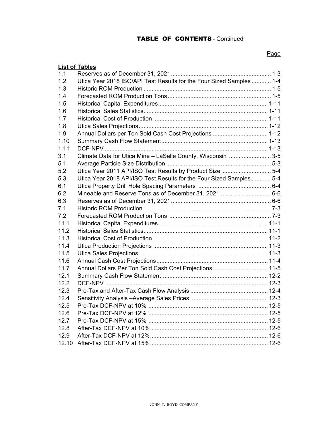 TABLE OF CONTENTS - Continued Page JOHN T. BOYD COMPANY List of Tables 1.1 Reserves as of December 31, 2021 .............................................................. 1-3 1.2 Utica Year 2018 ISO/API Test Results for the Four Sized Samples ............ 1-4 1.3 Historic ROM Production ............................................................................... 1-5 1.4 Forecasted ROM Production Tons ................................................................ 1-5 1.5 Historical Capital Expenditures .................................................................... 1-11 1.6 Historical Sales Statistics ............................................................................. 1-11 1.7 Historical Cost of Production ....................................................................... 1-11 1.8 Utica Sales Projections ................................................................................ 1-12 1.9 Annual Dollars per Ton Sold Cash Cost Projections .................................. 1-12 1.10 Summary Cash Flow Statement .................................................................. 1-13 1.11 DCF-NPV ..................................................................................................... 1-13 3.1 Climate Data for Utica Mine – LaSalle County, Wisconsin .......................... 3-5 5.1 Average Particle Size Distribution ................................................................ 5-3 5.2 Utica Year 2011 API/ISO Test Results by Product Size .............................. 5-4 5.3 Utica Year 2018 API/ISO Test Results for the Four Sized Samples ............ 5-4 6.1 Utica Property Drill Hole Spacing Parameters ............................................. 6-4 6.2 Mineable and Reserve Tons as of December 31, 2021 ............................... 6-6 6.3 Reserves as of December 31, 2021 .............................................................. 6-6 7.1 Historic ROM Production .............................................................................. 7-3 7.2 Forecasted ROM Production Tons ............................................................... 7-3 11.1 Historical Capital Expenditures ................................................................... 11-1 11.2 Historical Sales Statistics ............................................................................. 11-1 11.3 Historical Cost of Production ....................................................................... 11-2 11.4 Utica Production Projections ....................................................................... 11-3 11.5 Utica Sales Projections ................................................................................ 11-3 11.6 Annual Cash Cost Projections ..................................................................... 11-4 11.7 Annual Dollars Per Ton Sold Cash Cost Projections .................................. 11-5 12.1 Summary Cash Flow Statement ................................................................. 12-2 12.2 DCF-NPV .................................................................................................... 12-3 12.3 Pre-Tax and After-Tax Cash Flow Analysis ................................................ 12-4 12.4 Sensitivity Analysis –Average Sales Prices ............................................... 12-3 12.5 Pre-Tax DCF-NPV at 10% .......................................................................... 12-5 12.6 Pre-Tax DCF-NPV at 12% .......................................................................... 12-5 12.7 Pre-Tax DCF-NPV at 15% .......................................................................... 12-5 12.8 After-Tax DCF-NPV at 10% ......................................................................... 12-6 12.9 After-Tax DCF-NPV at 12% ......................................................................... 12-6 12.10 After-Tax DCF-NPV at 15% ......................................................................... 12-6