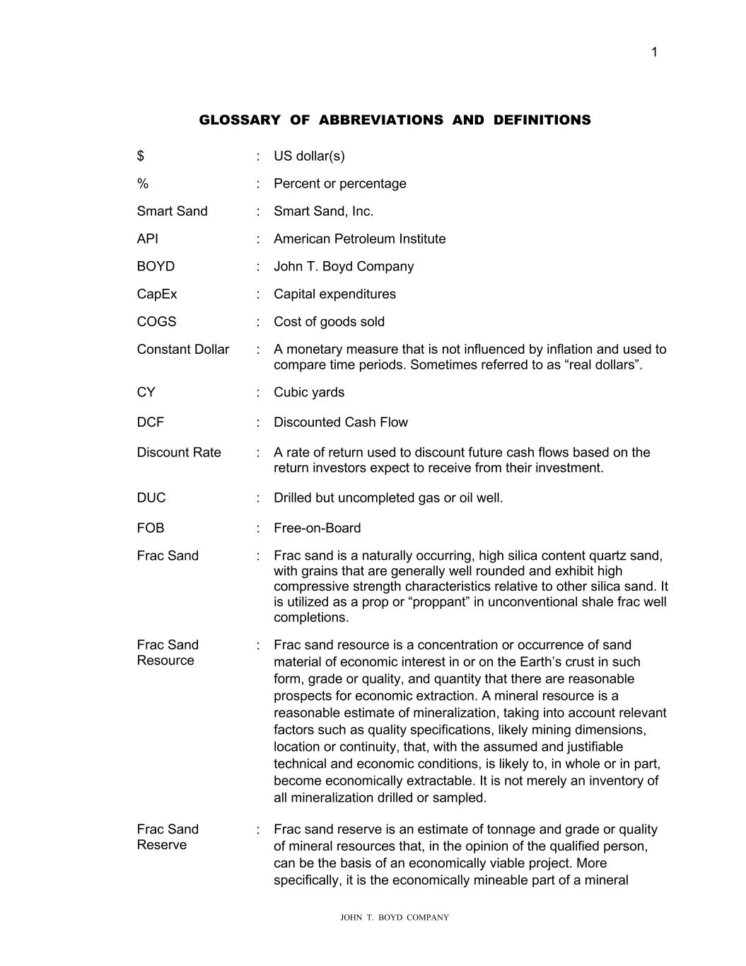 1 JOHN T. BOYD COMPANY GLOSSARY OF ABBREVIATIONS AND DEFINITIONS $ : US dollar(s) % : Percent or percentage Smart Sand : Smart Sand, Inc. API : American Petroleum Institute BOYD : John T. Boyd Company CapEx : Capital expenditures COGS : Cost of goods sold Constant Dollar : A monetary measure that is not influenced by inflation and used to compare time periods. Sometimes referred to as “real dollars”. CY : Cubic yards DCF : Discounted Cash Flow Discount Rate : A rate of return used to discount future cash flows based on the return investors expect to receive from their investment. DUC : Drilled but uncompleted gas or oil well. FOB : Free-on-Board Frac Sand : Frac sand is a naturally occurring, high silica content quartz sand, with grains that are generally well rounded and exhibit high compressive strength characteristics relative to other silica sand. It is utilized as a prop or “proppant” in unconventional shale frac well completions. Frac Sand Resource : Frac sand resource is a concentration or occurrence of sand material of economic interest in or on the Earth’s crust in such form, grade or quality, and quantity that there are reasonable prospects for economic extraction. A mineral resource is a reasonable estimate of mineralization, taking into account relevant factors such as quality specifications, likely mining dimensions, location or continuity, that, with the assumed and justifiable technical and economic conditions, is likely to, in whole or in part, become economically extractable. It is not merely an inventory of all mineralization drilled or sampled. Frac Sand Reserve : Frac sand reserve is an estimate of tonnage and grade or quality of mineral resources that, in the opinion of the qualified person, can be the basis of an economically viable project. More specifically, it is the economically mineable part of a mineral