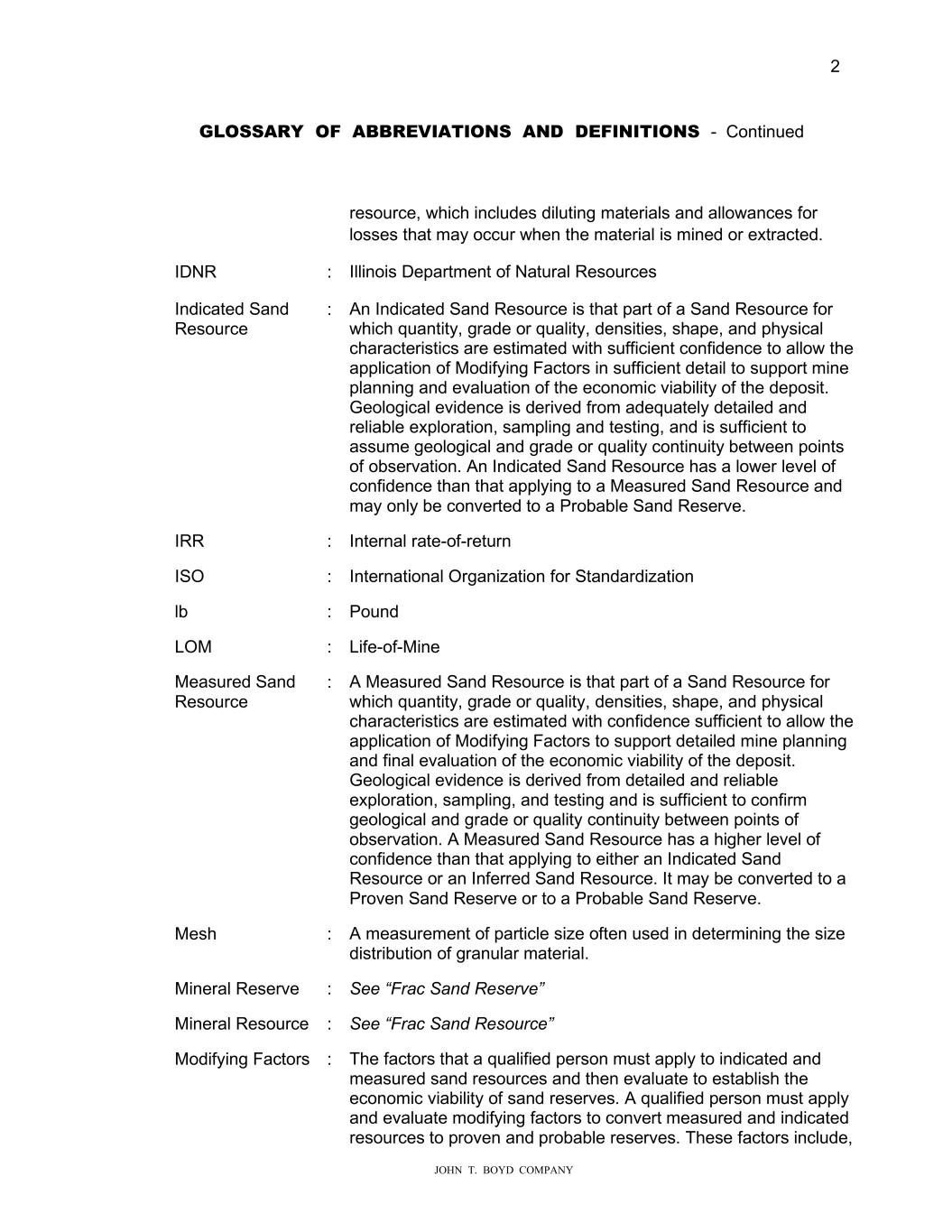 2 GLOSSARY OF ABBREVIATIONS AND DEFINITIONS - Continued JOHN T. BOYD COMPANY resource, which includes diluting materials and allowances for losses that may occur when the material is mined or extracted. IDNR : Illinois Department of Natural Resources Indicated Sand Resource : An Indicated Sand Resource is that part of a Sand Resource for which quantity, grade or quality, densities, shape, and physical characteristics are estimated with sufficient confidence to allow the application of Modifying Factors in sufficient detail to support mine planning and evaluation of the economic viability of the deposit. Geological evidence is derived from adequately detailed and reliable exploration, sampling and testing, and is sufficient to assume geological and grade or quality continuity between points of observation. An Indicated Sand Resource has a lower level of confidence than that applying to a Measured Sand Resource and may only be converted to a Probable Sand Reserve. IRR : Internal rate-of-return ISO : International Organization for Standardization lb : Pound LOM : Life-of-Mine Measured Sand Resource : A Measured Sand Resource is that part of a Sand Resource for which quantity, grade or quality, densities, shape, and physical characteristics are estimated with confidence sufficient to allow the application of Modifying Factors to support detailed mine planning and final evaluation of the economic viability of the deposit. Geological evidence is derived from detailed and reliable exploration, sampling, and testing and is sufficient to confirm geological and grade or quality continuity between points of observation. A Measured Sand Resource has a higher level of confidence than that applying to either an Indicated Sand Resource or an Inferred Sand Resource. It may be converted to a Proven Sand Reserve or to a Probable Sand Reserve. Mesh : A measurement of particle size often used in determining the size distribution of granular material. Mineral Reserve : See “Frac Sand Reserve” Mineral Resource : See “Frac Sand Resource” Modifying Factors : The factors that a qualified person must apply to indicated and measured sand resources and then evaluate to establish the economic viability of sand reserves. A qualified person must apply and evaluate modifying factors to convert measured and indicated resources to proven and probable reserves. These factors include,