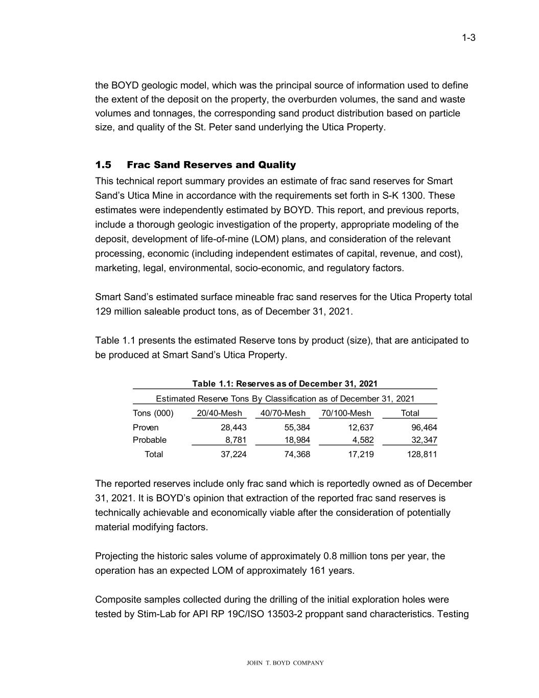 1-3 JOHN T. BOYD COMPANY the BOYD geologic model, which was the principal source of information used to define the extent of the deposit on the property, the overburden volumes, the sand and waste volumes and tonnages, the corresponding sand product distribution based on particle size, and quality of the St. Peter sand underlying the Utica Property. 1.5 Frac Sand Reserves and Quality This technical report summary provides an estimate of frac sand reserves for Smart Sand’s Utica Mine in accordance with the requirements set forth in S-K 1300. These estimates were independently estimated by BOYD. This report, and previous reports, include a thorough geologic investigation of the property, appropriate modeling of the deposit, development of life-of-mine (LOM) plans, and consideration of the relevant processing, economic (including independent estimates of capital, revenue, and cost), marketing, legal, environmental, socio-economic, and regulatory factors. Smart Sand’s estimated surface mineable frac sand reserves for the Utica Property total 129 million saleable product tons, as of December 31, 2021. Table 1.1 presents the estimated Reserve tons by product (size), that are anticipated to be produced at Smart Sand’s Utica Property. Estimated Reserve Tons By Classification as of December 31, 2021 Tons (000) 20/40-Mesh 40/70-Mesh 70/100-Mesh Total Proven 28,443 55,384 12,637 96,464 Probable 8,781 18,984 4,582 32,347 Total 37,224 74,368 17,219 128,811 Table 1.1: Reserves as of December 31, 2021 The reported reserves include only frac sand which is reportedly owned as of December 31, 2021. It is BOYD’s opinion that extraction of the reported frac sand reserves is technically achievable and economically viable after the consideration of potentially material modifying factors. Projecting the historic sales volume of approximately 0.8 million tons per year, the operation has an expected LOM of approximately 161 years. Composite samples collected during the drilling of the initial exploration holes were tested by Stim-Lab for API RP 19C/ISO 13503-2 proppant sand characteristics. Testing