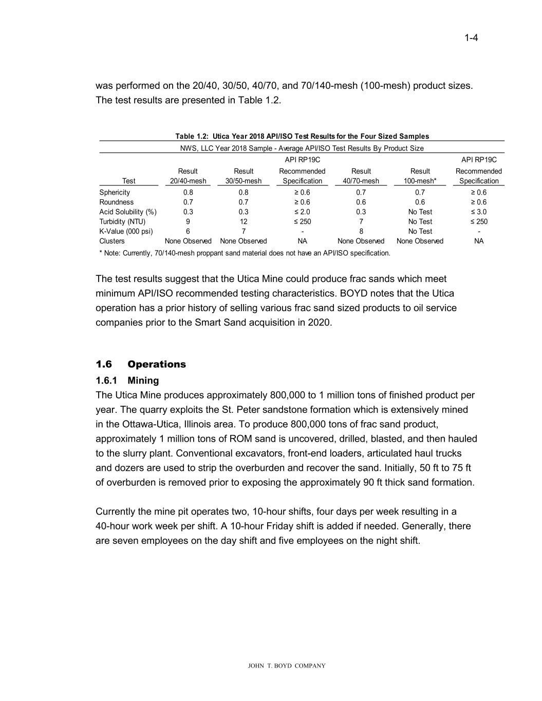 1-4 JOHN T. BOYD COMPANY was performed on the 20/40, 30/50, 40/70, and 70/140-mesh (100-mesh) product sizes. The test results are presented in Table 1.2. NWS, LLC Year 2018 Sample - Average API/ISO Test Results By Product Size API RP19C API RP19C Result Result Recommended Result Result Recommended Test 20/40-mesh 30/50-mesh Specification 40/70-mesh 100-mesh* Specification Sphericity 0.8 0.8 ≥ 0.6 0.7 0.7 ≥ 0.6 Roundness 0.7 0.7 ≥ 0.6 0.6 0.6 ≥ 0.6 Acid Solubility (%) 0.3 0.3 ≤ 2.0 0.3 No Test ≤ 3.0 Turbidity (NTU) 9 12 ≤ 250 7 No Test ≤ 250 K-Value (000 psi) 6 7 - 8 No Test - Clusters None Observed None Observed NA None Observed None Observed NA * Note: Currently, 70/140-mesh proppant sand material does not have an API/ISO specification. Table 1.2: Utica Year 2018 API/ISO Test Results for the Four Sized Samples The test results suggest that the Utica Mine could produce frac sands which meet minimum API/ISO recommended testing characteristics. BOYD notes that the Utica operation has a prior history of selling various frac sand sized products to oil service companies prior to the Smart Sand acquisition in 2020. 1.6 Operations 1.6.1 Mining The Utica Mine produces approximately 800,000 to 1 million tons of finished product per year. The quarry exploits the St. Peter sandstone formation which is extensively mined in the Ottawa-Utica, Illinois area. To produce 800,000 tons of frac sand product, approximately 1 million tons of ROM sand is uncovered, drilled, blasted, and then hauled to the slurry plant. Conventional excavators, front-end loaders, articulated haul trucks and dozers are used to strip the overburden and recover the sand. Initially, 50 ft to 75 ft of overburden is removed prior to exposing the approximately 90 ft thick sand formation. Currently the mine pit operates two, 10-hour shifts, four days per week resulting in a 40-hour work week per shift. A 10-hour Friday shift is added if needed. Generally, there are seven employees on the day shift and five employees on the night shift.