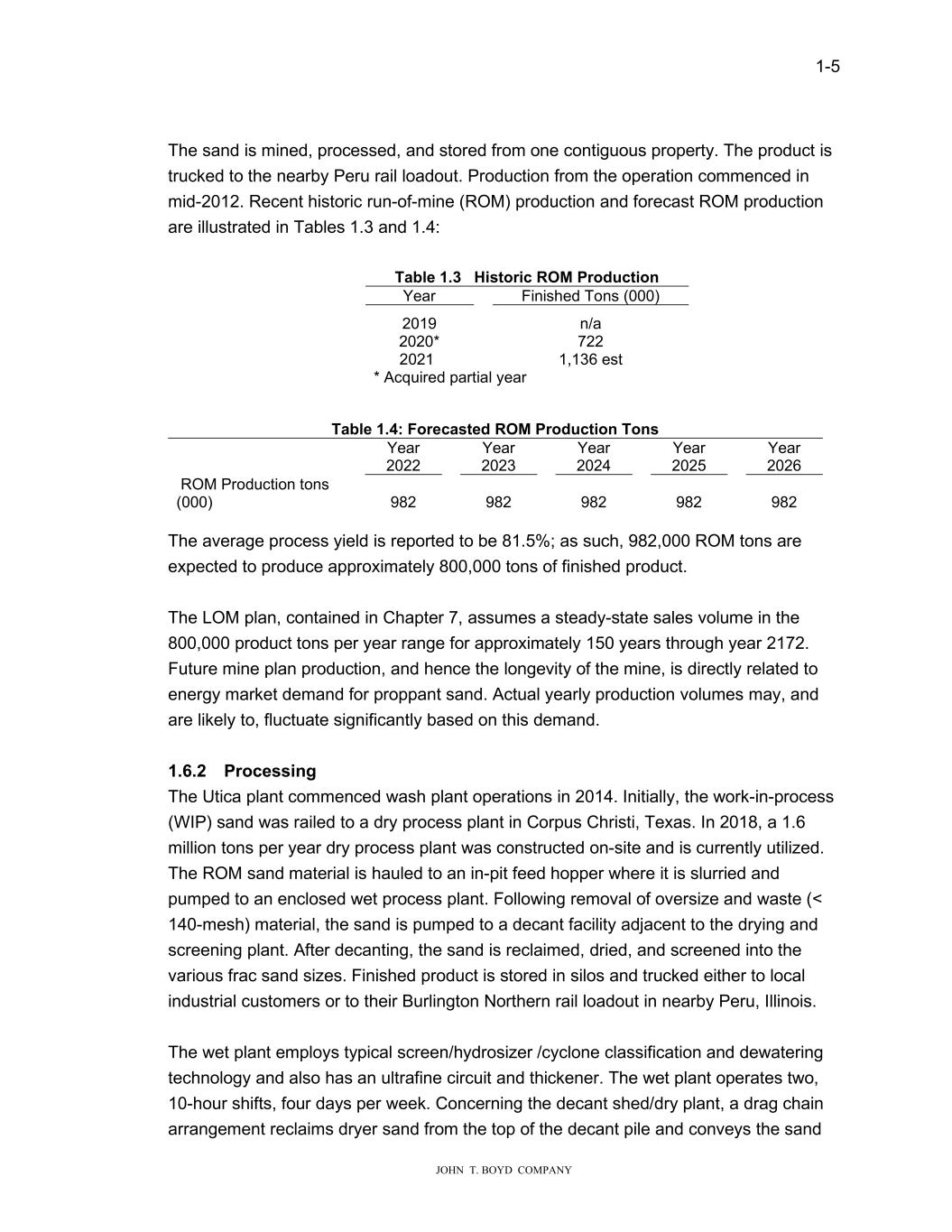 1-5 JOHN T. BOYD COMPANY The sand is mined, processed, and stored from one contiguous property. The product is trucked to the nearby Peru rail loadout. Production from the operation commenced in mid-2012. Recent historic run-of-mine (ROM) production and forecast ROM production are illustrated in Tables 1.3 and 1.4: Table 1.3 Historic ROM Production Year Finished Tons (000) 2019 n/a 2020* 722 2021 1,136 est * Acquired partial year Table 1.4: Forecasted ROM Production Tons Year 2022 Year 2023 Year 2024 Year 2025 Year 2026 ROM Production tons (000) 982 982 982 982 982 The average process yield is reported to be 81.5%; as such, 982,000 ROM tons are expected to produce approximately 800,000 tons of finished product. The LOM plan, contained in Chapter 7, assumes a steady-state sales volume in the 800,000 product tons per year range for approximately 150 years through year 2172. Future mine plan production, and hence the longevity of the mine, is directly related to energy market demand for proppant sand. Actual yearly production volumes may, and are likely to, fluctuate significantly based on this demand. 1.6.2 Processing The Utica plant commenced wash plant operations in 2014. Initially, the work-in-process (WIP) sand was railed to a dry process plant in Corpus Christi, Texas. In 2018, a 1.6 million tons per year dry process plant was constructed on-site and is currently utilized. The ROM sand material is hauled to an in-pit feed hopper where it is slurried and pumped to an enclosed wet process plant. Following removal of oversize and waste (< 140-mesh) material, the sand is pumped to a decant facility adjacent to the drying and screening plant. After decanting, the sand is reclaimed, dried, and screened into the various frac sand sizes. Finished product is stored in silos and trucked either to local industrial customers or to their Burlington Northern rail loadout in nearby Peru, Illinois. The wet plant employs typical screen/hydrosizer /cyclone classification and dewatering technology and also has an ultrafine circuit and thickener. The wet plant operates two, 10-hour shifts, four days per week. Concerning the decant shed/dry plant, a drag chain arrangement reclaims dryer sand from the top of the decant pile and conveys the sand