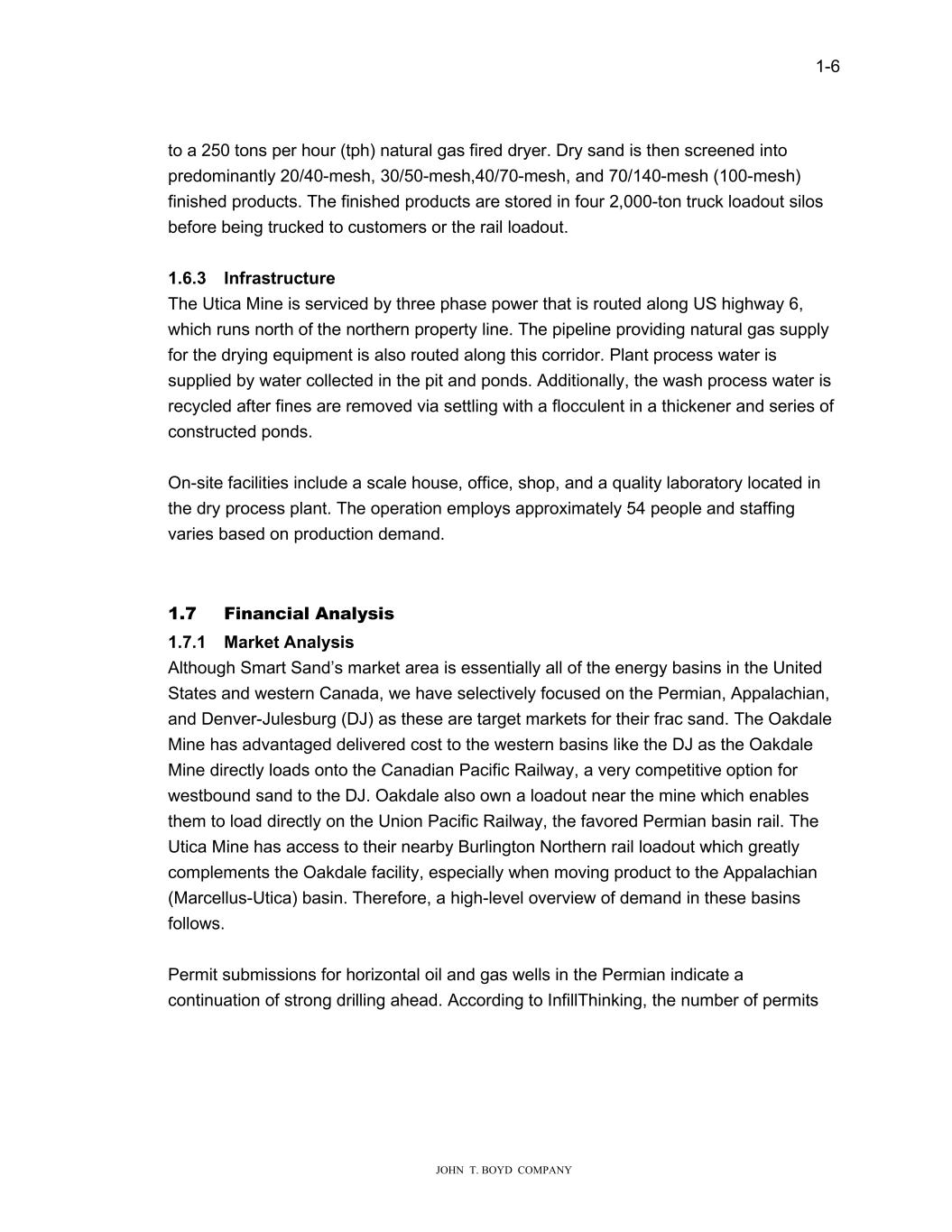 1-6 JOHN T. BOYD COMPANY to a 250 tons per hour (tph) natural gas fired dryer. Dry sand is then screened into predominantly 20/40-mesh, 30/50-mesh,40/70-mesh, and 70/140-mesh (100-mesh) finished products. The finished products are stored in four 2,000-ton truck loadout silos before being trucked to customers or the rail loadout. 1.6.3 Infrastructure The Utica Mine is serviced by three phase power that is routed along US highway 6, which runs north of the northern property line. The pipeline providing natural gas supply for the drying equipment is also routed along this corridor. Plant process water is supplied by water collected in the pit and ponds. Additionally, the wash process water is recycled after fines are removed via settling with a flocculent in a thickener and series of constructed ponds. On-site facilities include a scale house, office, shop, and a quality laboratory located in the dry process plant. The operation employs approximately 54 people and staffing varies based on production demand. 1.7 Financial Analysis 1.7.1 Market Analysis Although Smart Sand’s market area is essentially all of the energy basins in the United States and western Canada, we have selectively focused on the Permian, Appalachian, and Denver-Julesburg (DJ) as these are target markets for their frac sand. The Oakdale Mine has advantaged delivered cost to the western basins like the DJ as the Oakdale Mine directly loads onto the Canadian Pacific Railway, a very competitive option for westbound sand to the DJ. Oakdale also own a loadout near the mine which enables them to load directly on the Union Pacific Railway, the favored Permian basin rail. The Utica Mine has access to their nearby Burlington Northern rail loadout which greatly complements the Oakdale facility, especially when moving product to the Appalachian (Marcellus-Utica) basin. Therefore, a high-level overview of demand in these basins follows. Permit submissions for horizontal oil and gas wells in the Permian indicate a continuation of strong drilling ahead. According to InfillThinking, the number of permits
