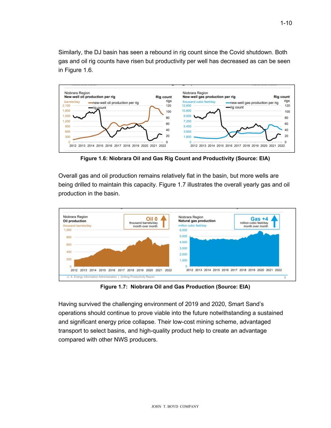 1-10 JOHN T. BOYD COMPANY Similarly, the DJ basin has seen a rebound in rig count since the Covid shutdown. Both gas and oil rig counts have risen but productivity per well has decreased as can be seen in Figure 1.6. Figure 1.6: Niobrara Oil and Gas Rig Count and Productivity (Source: EIA) Overall gas and oil production remains relatively flat in the basin, but more wells are being drilled to maintain this capacity. Figure 1.7 illustrates the overall yearly gas and oil production in the basin. Figure 1.7: Niobrara Oil and Gas Production (Source: EIA) Having survived the challenging environment of 2019 and 2020, Smart Sand’s operations should continue to prove viable into the future notwithstanding a sustained and significant energy price collapse. Their low-cost mining scheme, advantaged transport to select basins, and high-quality product help to create an advantage compared with other NWS producers.