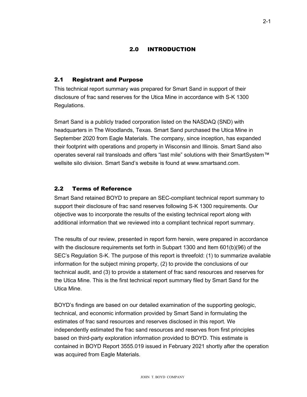 2-1 JOHN T. BOYD COMPANY 2.0 INTRODUCTION 2.1 Registrant and Purpose This technical report summary was prepared for Smart Sand in support of their disclosure of frac sand reserves for the Utica Mine in accordance with S-K 1300 Regulations. Smart Sand is a publicly traded corporation listed on the NASDAQ (SND) with headquarters in The Woodlands, Texas. Smart Sand purchased the Utica Mine in September 2020 from Eagle Materials. The company, since inception, has expanded their footprint with operations and property in Wisconsin and Illinois. Smart Sand also operates several rail transloads and offers “last mile” solutions with their SmartSystem™ wellsite silo division. Smart Sand’s website is found at www.smartsand.com. 2.2 Terms of Reference Smart Sand retained BOYD to prepare an SEC-compliant technical report summary to support their disclosure of frac sand reserves following S-K 1300 requirements. Our objective was to incorporate the results of the existing technical report along with additional information that we reviewed into a compliant technical report summary. The results of our review, presented in report form herein, were prepared in accordance with the disclosure requirements set forth in Subpart 1300 and Item 601(b)(96) of the SEC’s Regulation S-K. The purpose of this report is threefold: (1) to summarize available information for the subject mining property, (2) to provide the conclusions of our technical audit, and (3) to provide a statement of frac sand resources and reserves for the Utica Mine. This is the first technical report summary filed by Smart Sand for the Utica Mine. BOYD’s findings are based on our detailed examination of the supporting geologic, technical, and economic information provided by Smart Sand in formulating the estimates of frac sand resources and reserves disclosed in this report. We independently estimated the frac sand resources and reserves from first principles based on third-party exploration information provided to BOYD. This estimate is contained in BOYD Report 3555.019 issued in February 2021 shortly after the operation was acquired from Eagle Materials.