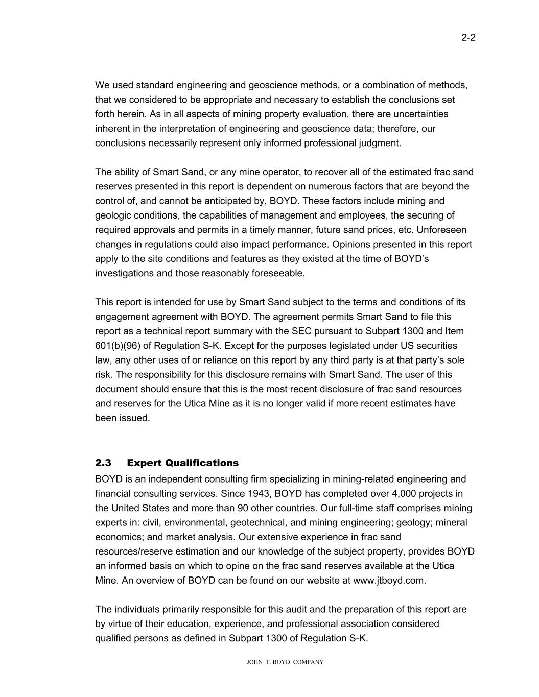 2-2 JOHN T. BOYD COMPANY We used standard engineering and geoscience methods, or a combination of methods, that we considered to be appropriate and necessary to establish the conclusions set forth herein. As in all aspects of mining property evaluation, there are uncertainties inherent in the interpretation of engineering and geoscience data; therefore, our conclusions necessarily represent only informed professional judgment. The ability of Smart Sand, or any mine operator, to recover all of the estimated frac sand reserves presented in this report is dependent on numerous factors that are beyond the control of, and cannot be anticipated by, BOYD. These factors include mining and geologic conditions, the capabilities of management and employees, the securing of required approvals and permits in a timely manner, future sand prices, etc. Unforeseen changes in regulations could also impact performance. Opinions presented in this report apply to the site conditions and features as they existed at the time of BOYD’s investigations and those reasonably foreseeable. This report is intended for use by Smart Sand subject to the terms and conditions of its engagement agreement with BOYD. The agreement permits Smart Sand to file this report as a technical report summary with the SEC pursuant to Subpart 1300 and Item 601(b)(96) of Regulation S-K. Except for the purposes legislated under US securities law, any other uses of or reliance on this report by any third party is at that party’s sole risk. The responsibility for this disclosure remains with Smart Sand. The user of this document should ensure that this is the most recent disclosure of frac sand resources and reserves for the Utica Mine as it is no longer valid if more recent estimates have been issued. 2.3 Expert Qualifications BOYD is an independent consulting firm specializing in mining-related engineering and financial consulting services. Since 1943, BOYD has completed over 4,000 projects in the United States and more than 90 other countries. Our full-time staff comprises mining experts in: civil, environmental, geotechnical, and mining engineering; geology; mineral economics; and market analysis. Our extensive experience in frac sand resources/reserve estimation and our knowledge of the subject property, provides BOYD an informed basis on which to opine on the frac sand reserves available at the Utica Mine. An overview of BOYD can be found on our website at www.jtboyd.com. The individuals primarily responsible for this audit and the preparation of this report are by virtue of their education, experience, and professional association considered qualified persons as defined in Subpart 1300 of Regulation S-K.