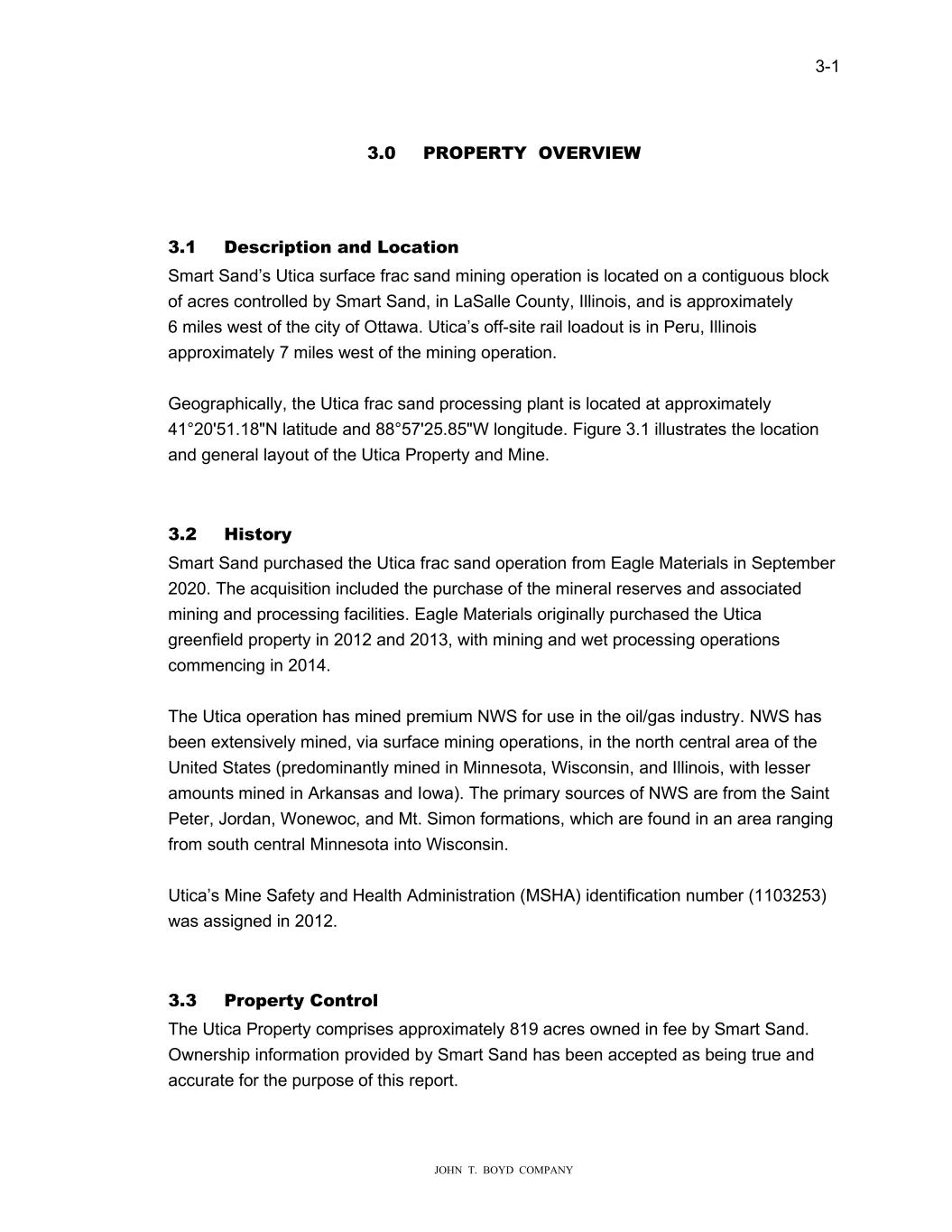 3-1 JOHN T. BOYD COMPANY 3.0 PROPERTY OVERVIEW 3.1 Description and Location Smart Sand’s Utica surface frac sand mining operation is located on a contiguous block of acres controlled by Smart Sand, in LaSalle County, Illinois, and is approximately 6 miles west of the city of Ottawa. Utica’s off-site rail loadout is in Peru, Illinois approximately 7 miles west of the mining operation. Geographically, the Utica frac sand processing plant is located at approximately 41°20'51.18"N latitude and 88°57'25.85"W longitude. Figure 3.1 illustrates the location and general layout of the Utica Property and Mine. 3.2 History Smart Sand purchased the Utica frac sand operation from Eagle Materials in September 2020. The acquisition included the purchase of the mineral reserves and associated mining and processing facilities. Eagle Materials originally purchased the Utica greenfield property in 2012 and 2013, with mining and wet processing operations commencing in 2014. The Utica operation has mined premium NWS for use in the oil/gas industry. NWS has been extensively mined, via surface mining operations, in the north central area of the United States (predominantly mined in Minnesota, Wisconsin, and Illinois, with lesser amounts mined in Arkansas and Iowa). The primary sources of NWS are from the Saint Peter, Jordan, Wonewoc, and Mt. Simon formations, which are found in an area ranging from south central Minnesota into Wisconsin. Utica’s Mine Safety and Health Administration (MSHA) identification number (1103253) was assigned in 2012. 3.3 Property Control The Utica Property comprises approximately 819 acres owned in fee by Smart Sand. Ownership information provided by Smart Sand has been accepted as being true and accurate for the purpose of this report.