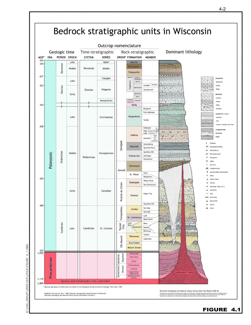 4-1 JOHN T. BOYD COMPANY 4.0 GEOLOGY 4.1 Regional Geology NWS are generally located in the north-central portion of the United States (predominantly in Minnesota, Wisconsin, and Illinois, with lesser amounts in Arkansas and Iowa). NWS is found in poorly cemented Cambrian and Ordovician sandstones and in unconsolidated alluvial deposits locally derived from these sandstones. The Saint Peter, Jordan, Wonewoc, and Mount Simon Formations, located in south-central Minnesota into Wisconsin, are the primary sources of NWS. Figure 4.1, on the following page, presents the various stratigraphic rock units in Wisconsin, which are similar to the rock units encountered in Illinois. The Utica Property’s target silica bearing formation is the St. Peter Sandstone, which is a massive formation in areal extent and thickness. Areally, it extends from Minnesota to Arkansas and from Illinois into Nebraska and South Dakota. On a regional basis, the St. Peter ranges in thickness from a few feet to over 700 ft, with a general thickness of 100 ft to 200 ft. In northern Illinois, the thickness can be over 300 ft thick. Sand comprising the St. Peter Formation was originally deposited in clear shallow water near the shore of a Paleozoic Sea. The St. Peter sandstone can be generally described as well sorted, well rounded, fine to medium size frosted grains of exceptionally pure quartz sands free from clay, carbonates, and heavy minerals that are friable or weakly cemented. As such, the sand is valued in the marketplace for its high silica content and is extensively quarried for silica sand. The St. Peter sandstone is one of the major aquifers in Illinois. On a regional basis the properties of the formation exhibit grain size that is generally uniform and normally grades from medium to medium-coarse in the upper section, to medium to fine-grained in the lower section. As a rule, the lower portion of the formation is fine-grained with iron, alumina, and carbonate contamination increasing with depth. The St. Peter Formation is of Ordovician age (early middle). It is the lower formation of the Anceli Group and overlies the Shakopee Dolomite. 4.2 Local Stratigraphy The surface of the Utica property is overlain by overburden that ranges in thickness from 57 ft to 77 ft, with an average thickness of approximately 66 ft. The overburden