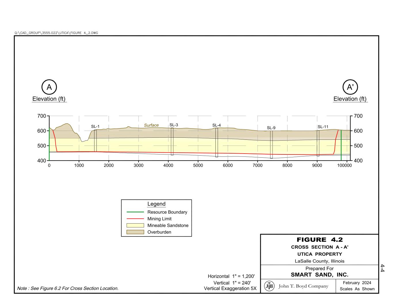 1-2 JOHN T. BOYD COMPANY Smart Sand acquired the Utica operation from Eagle Materials Incorporated (Eagle Materials) in 2020. The mine exploits the St. Peter sandstone formation which generally lies approximately 40 ft to 60 ft below the land surface in the area. 1.3 Geology The Utica Property’s target silica bearing formation is the St. Peter sandstone, which is a massive formation in areal extent and thickness. Aerially, it extends from Minnesota to Arkansas and from Illinois into Nebraska and South Dakota. On a regional basis, the St. Peter ranges in thickness from a few feet to over 700 ft, with a general thickness of 100 ft to 200 ft. In northern Illinois, the thickness can be over 300 ft thick. The surface of the Utica Property is overlain by overburden that ranges in thickness from 57 ft to 77 ft, with an average thickness of approximately 66 ft. The overburden material consists of clay, sandy gravel, peat, and limestone cap rock. Beneath the overburden material is the St. Peter sandstone formation. The St. Peter deposit on the Utica Property is flat lying with no evidence of faulting, and has been eroded to an average thickness of approximately 100 ft. The formation is a white to buff, with fine to medium grained ortho-quartzite. It contains rounded, clear polished sand quartz grains with minor secondary silica and clay cement. Care must be taken in defining the presence of erosion channels, which can replace the critical upper portion of the St. Peter sandstone formation locally. Grain size distribution drives the mine planning. Iron tends to be concentrated near the surface and is visible in orange staining. Iron also increases at the bottom sandstone contact, occurring mostly as pyrite. The deposit is coarser in its top half. Where the upper part of the formation is eroded, multiple mining faces must operate to ensure adequate sand is available to meet product specifications. 1.4 Exploration Based on information provided by Smart Sand to BOYD, we note that there were several exploration drilling programs performed on the Utica Property, the most recent of which was in 2017. Overall, there were 29 holes drilled on the property. However, BOYD utilized the results of only 14 exploration holes to develop the geologic model of the Utica deposit. The lithologic data obtained from the 14 holes, the results of the particle size distribution, and the results of the Stim-Lab analyses, were compiled into a database for input into