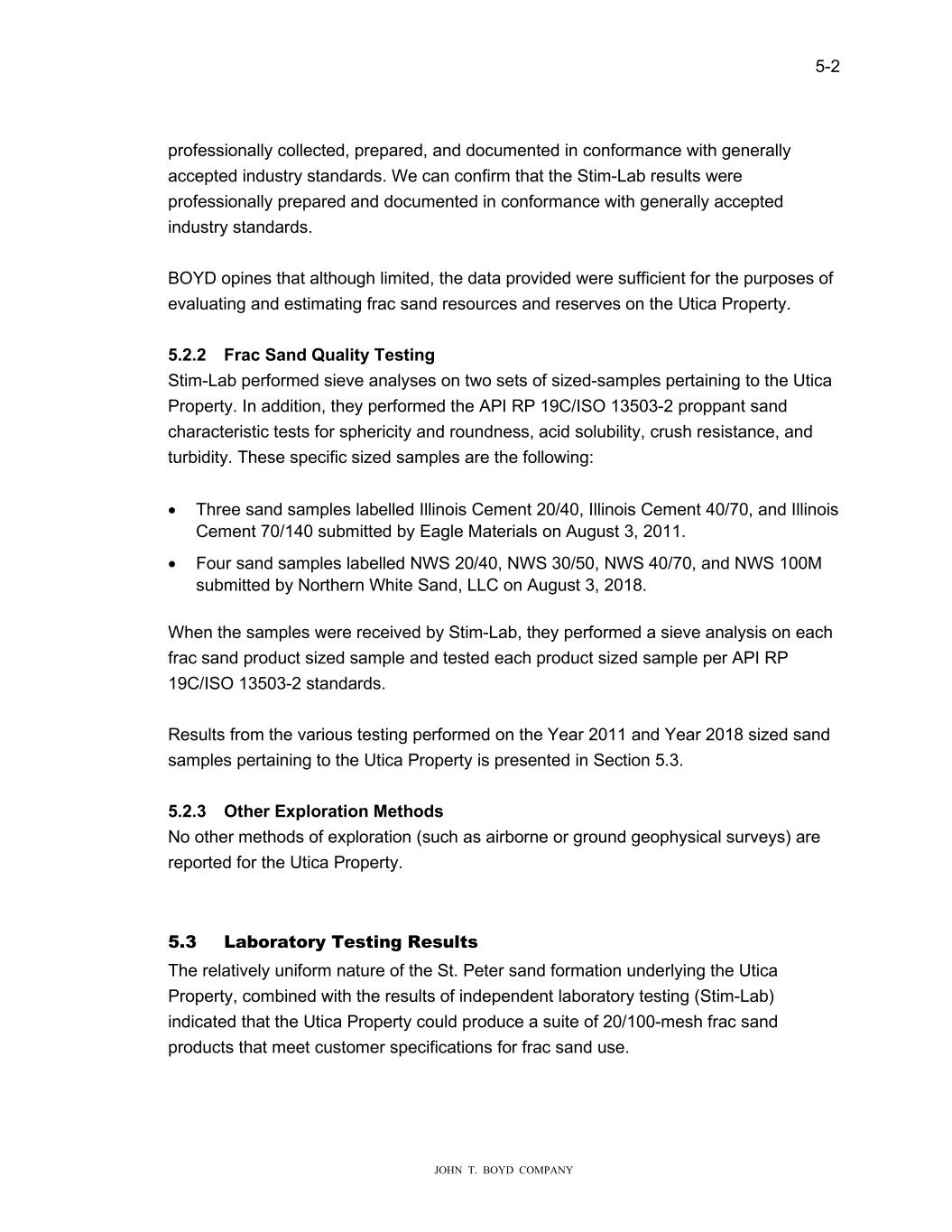 5-2 JOHN T. BOYD COMPANY professionally collected, prepared, and documented in conformance with generally accepted industry standards. We can confirm that the Stim-Lab results were professionally prepared and documented in conformance with generally accepted industry standards. BOYD opines that although limited, the data provided were sufficient for the purposes of evaluating and estimating frac sand resources and reserves on the Utica Property. 5.2.2 Frac Sand Quality Testing Stim-Lab performed sieve analyses on two sets of sized-samples pertaining to the Utica Property. In addition, they performed the API RP 19C/ISO 13503-2 proppant sand characteristic tests for sphericity and roundness, acid solubility, crush resistance, and turbidity. These specific sized samples are the following: • Three sand samples labelled Illinois Cement 20/40, Illinois Cement 40/70, and Illinois Cement 70/140 submitted by Eagle Materials on August 3, 2011. • Four sand samples labelled NWS 20/40, NWS 30/50, NWS 40/70, and NWS 100M submitted by Northern White Sand, LLC on August 3, 2018. When the samples were received by Stim-Lab, they performed a sieve analysis on each frac sand product sized sample and tested each product sized sample per API RP 19C/ISO 13503-2 standards. Results from the various testing performed on the Year 2011 and Year 2018 sized sand samples pertaining to the Utica Property is presented in Section 5.3. 5.2.3 Other Exploration Methods No other methods of exploration (such as airborne or ground geophysical surveys) are reported for the Utica Property. 5.3 Laboratory Testing Results The relatively uniform nature of the St. Peter sand formation underlying the Utica Property, combined with the results of independent laboratory testing (Stim-Lab) indicated that the Utica Property could produce a suite of 20/100-mesh frac sand products that meet customer specifications for frac sand use.