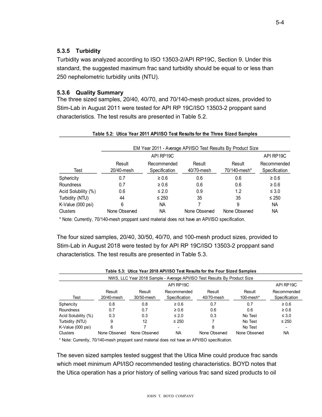 5-4 JOHN T. BOYD COMPANY 5.3.5 Turbidity Turbidity was analyzed according to ISO 13503-2/API RP19C, Section 9. Under this standard, the suggested maximum frac sand turbidity should be equal to or less than 250 nephelometric turbidity units (NTU). 5.3.6 Quality Summary The three sized samples, 20/40, 40/70, and 70/140-mesh product sizes, provided to Stim-Lab in August 2011 were tested for API RP 19C/ISO 13503-2 proppant sand characteristics. The test results are presented in Table 5.2. EM Year 2011 - Average API/ISO Test Results By Product Size API RP19C API RP19C Result Recommended Result Result Recommended Test 20/40-mesh Specification 40/70-mesh 70/140-mesh* Specification Sphericity 0.7 ≥ 0.6 0.6 0.6 ≥ 0.6 Roundness 0.7 ≥ 0.6 0.6 0.6 ≥ 0.6 Acid Solubility (%) 0.6 ≤ 2.0 0.9 1.2 ≤ 3.0 Turbidity (NTU) 44 ≤ 250 35 35 ≤ 250 K-Value (000 psi) 6 NA 7 9 NA Clusters None Observed NA None Observed None Observed NA * Note: Currently, 70/140-mesh proppant sand material does not have an API/ISO specification. Table 5.2: Utica Year 2011 API/ISO Test Results for the Three Sized Samples The four sized samples, 20/40, 30/50, 40/70, and 100-mesh product sizes, provided to Stim-Lab in August 2018 were tested by for API RP 19C/ISO 13503-2 proppant sand characteristics. The test results are presented in Table 5.3. NWS, LLC Year 2018 Sample - Average API/ISO Test Results By Product Size API RP19C API RP19C Result Result Recommended Result Result Recommended Test 20/40-mesh 30/50-mesh Specification 40/70-mesh 100-mesh* Specification Sphericity 0.8 0.8 ≥ 0.6 0.7 0.7 ≥ 0.6 Roundness 0.7 0.7 ≥ 0.6 0.6 0.6 ≥ 0.6 Acid Solubility (%) 0.3 0.3 ≤ 2.0 0.3 No Test ≤ 3.0 Turbidity (NTU) 9 12 ≤ 250 7 No Test ≤ 250 K-Value (000 psi) 6 7 - 8 No Test - Clusters None Observed None Observed NA None Observed None Observed NA * Note: Currently, 70/140-mesh proppant sand material does not have an API/ISO specification. Table 5.3: Utica Year 2018 API/ISO Test Results for the Four Sized Samples The seven sized samples tested suggest that the Utica Mine could produce frac sands which meet minimum API/ISO recommended testing characteristics. BOYD notes that the Utica operation has a prior history of selling various frac sand sized products to oil