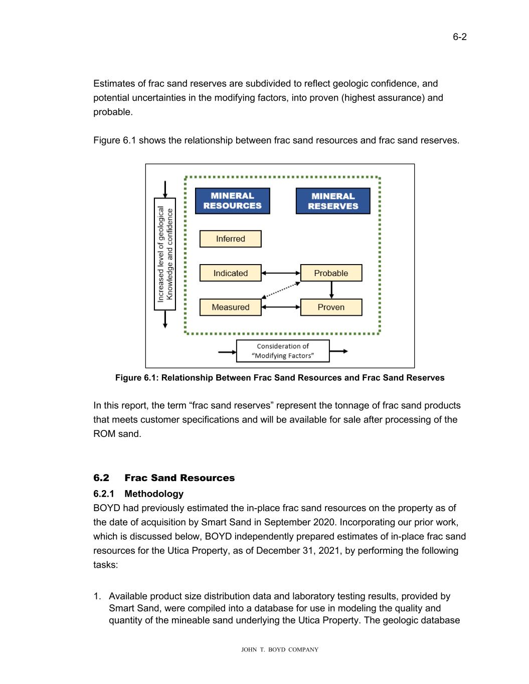 6-2 JOHN T. BOYD COMPANY Estimates of frac sand reserves are subdivided to reflect geologic confidence, and potential uncertainties in the modifying factors, into proven (highest assurance) and probable. Figure 6.1 shows the relationship between frac sand resources and frac sand reserves. Figure 6.1: Relationship Between Frac Sand Resources and Frac Sand Reserves In this report, the term “frac sand reserves” represent the tonnage of frac sand products that meets customer specifications and will be available for sale after processing of the ROM sand. 6.2 Frac Sand Resources 6.2.1 Methodology BOYD had previously estimated the in-place frac sand resources on the property as of the date of acquisition by Smart Sand in September 2020. Incorporating our prior work, which is discussed below, BOYD independently prepared estimates of in-place frac sand resources for the Utica Property, as of December 31, 2021, by performing the following tasks: 1. Available product size distribution data and laboratory testing results, provided by Smart Sand, were compiled into a database for use in modeling the quality and quantity of the mineable sand underlying the Utica Property. The geologic database