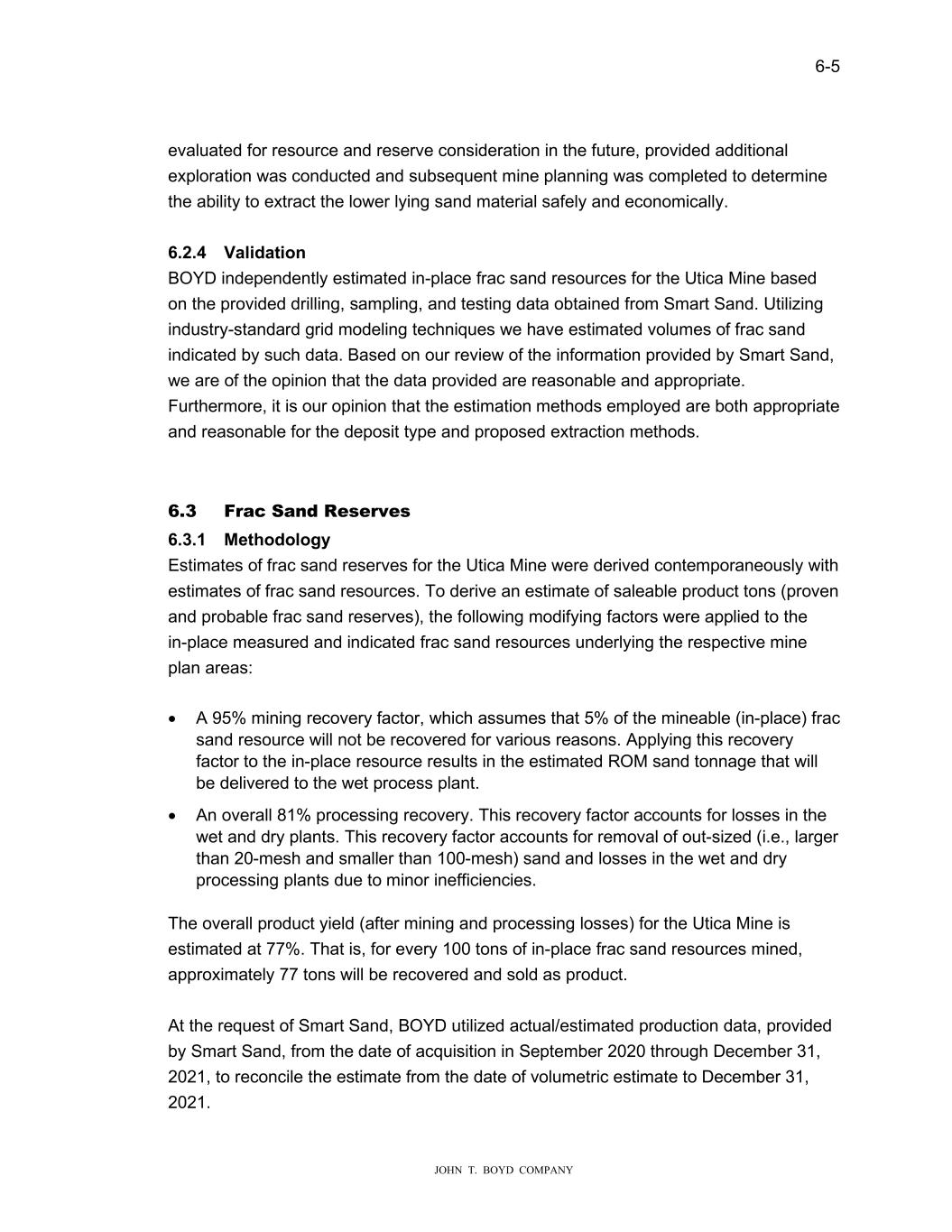 6-5 JOHN T. BOYD COMPANY evaluated for resource and reserve consideration in the future, provided additional exploration was conducted and subsequent mine planning was completed to determine the ability to extract the lower lying sand material safely and economically. 6.2.4 Validation BOYD independently estimated in-place frac sand resources for the Utica Mine based on the provided drilling, sampling, and testing data obtained from Smart Sand. Utilizing industry-standard grid modeling techniques we have estimated volumes of frac sand indicated by such data. Based on our review of the information provided by Smart Sand, we are of the opinion that the data provided are reasonable and appropriate. Furthermore, it is our opinion that the estimation methods employed are both appropriate and reasonable for the deposit type and proposed extraction methods. 6.3 Frac Sand Reserves 6.3.1 Methodology Estimates of frac sand reserves for the Utica Mine were derived contemporaneously with estimates of frac sand resources. To derive an estimate of saleable product tons (proven and probable frac sand reserves), the following modifying factors were applied to the in-place measured and indicated frac sand resources underlying the respective mine plan areas: • A 95% mining recovery factor, which assumes that 5% of the mineable (in-place) frac sand resource will not be recovered for various reasons. Applying this recovery factor to the in-place resource results in the estimated ROM sand tonnage that will be delivered to the wet process plant. • An overall 81% processing recovery. This recovery factor accounts for losses in the wet and dry plants. This recovery factor accounts for removal of out-sized (i.e., larger than 20-mesh and smaller than 100-mesh) sand and losses in the wet and dry processing plants due to minor inefficiencies. The overall product yield (after mining and processing losses) for the Utica Mine is estimated at 77%. That is, for every 100 tons of in-place frac sand resources mined, approximately 77 tons will be recovered and sold as product. At the request of Smart Sand, BOYD utilized actual/estimated production data, provided by Smart Sand, from the date of acquisition in September 2020 through December 31, 2021, to reconcile the estimate from the date of volumetric estimate to December 31, 2021.