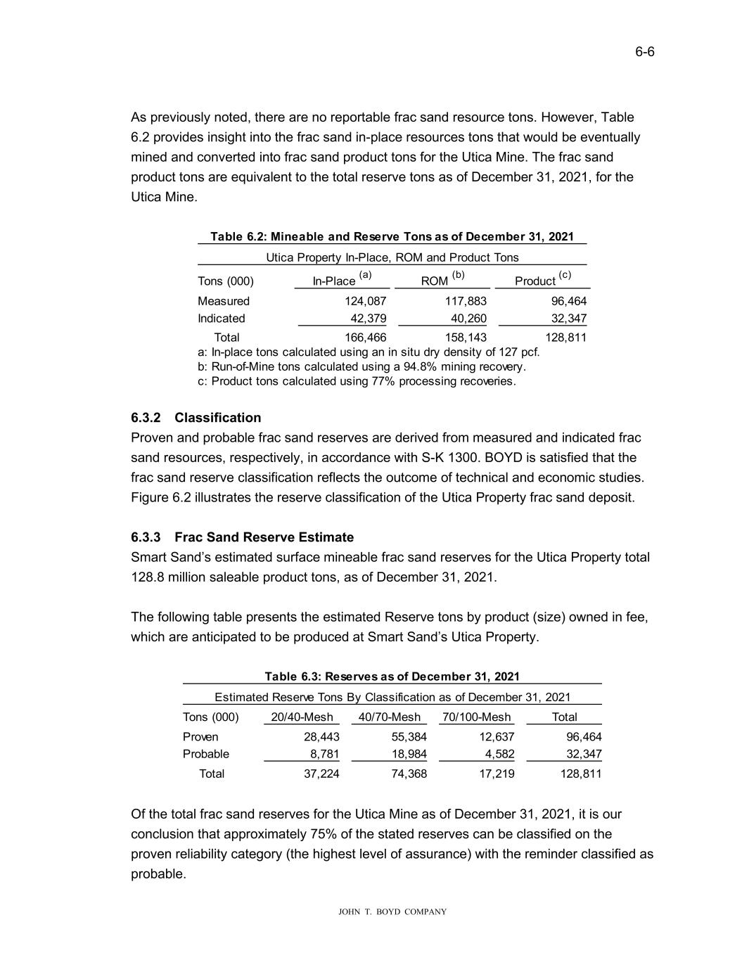 6-6 JOHN T. BOYD COMPANY As previously noted, there are no reportable frac sand resource tons. However, Table 6.2 provides insight into the frac sand in-place resources tons that would be eventually mined and converted into frac sand product tons for the Utica Mine. The frac sand product tons are equivalent to the total reserve tons as of December 31, 2021, for the Utica Mine. Utica Property In-Place, ROM and Product Tons Tons (000) In-Place (a) ROM (b) Product (c) Measured 124,087 117,883 96,464 Indicated 42,379 40,260 32,347 Total 166,466 158,143 128,811 a: In-place tons calculated using an in situ dry density of 127 pcf. b: Run-of-Mine tons calculated using a 94.8% mining recovery. c: Product tons calculated using 77% processing recoveries. Table 6.2: Mineable and Reserve Tons as of December 31, 2021 6.3.2 Classification Proven and probable frac sand reserves are derived from measured and indicated frac sand resources, respectively, in accordance with S-K 1300. BOYD is satisfied that the frac sand reserve classification reflects the outcome of technical and economic studies. Figure 6.2 illustrates the reserve classification of the Utica Property frac sand deposit. 6.3.3 Frac Sand Reserve Estimate Smart Sand’s estimated surface mineable frac sand reserves for the Utica Property total 128.8 million saleable product tons, as of December 31, 2021. The following table presents the estimated Reserve tons by product (size) owned in fee, which are anticipated to be produced at Smart Sand’s Utica Property. Estimated Reserve Tons By Classification as of December 31, 2021 Tons (000) 20/40-Mesh 40/70-Mesh 70/100-Mesh Total Proven 28,443 55,384 12,637 96,464 Probable 8,781 18,984 4,582 32,347 Total 37,224 74,368 17,219 128,811 Table 6.3: Reserves as of December 31, 2021 Of the total frac sand reserves for the Utica Mine as of December 31, 2021, it is our conclusion that approximately 75% of the stated reserves can be classified on the proven reliability category (the highest level of assurance) with the reminder classified as probable.