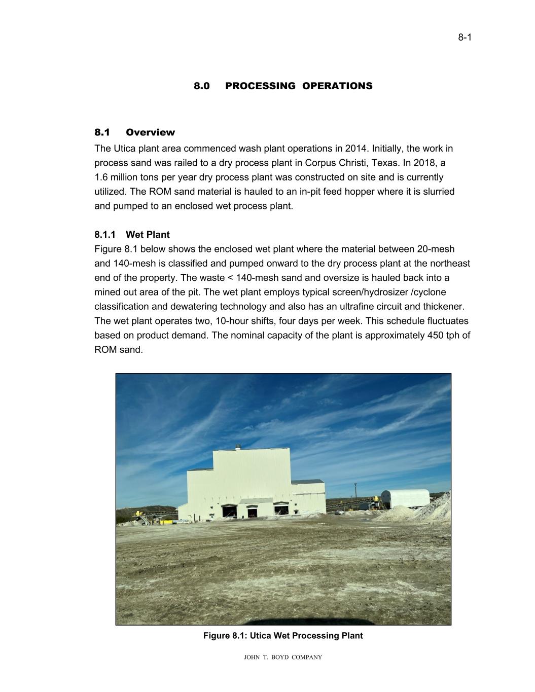 8-1 JOHN T. BOYD COMPANY 8.0 PROCESSING OPERATIONS 8.1 Overview The Utica plant area commenced wash plant operations in 2014. Initially, the work in process sand was railed to a dry process plant in Corpus Christi, Texas. In 2018, a 1.6 million tons per year dry process plant was constructed on site and is currently utilized. The ROM sand material is hauled to an in-pit feed hopper where it is slurried and pumped to an enclosed wet process plant. 8.1.1 Wet Plant Figure 8.1 below shows the enclosed wet plant where the material between 20-mesh and 140-mesh is classified and pumped onward to the dry process plant at the northeast end of the property. The waste < 140-mesh sand and oversize is hauled back into a mined out area of the pit. The wet plant employs typical screen/hydrosizer /cyclone classification and dewatering technology and also has an ultrafine circuit and thickener. The wet plant operates two, 10-hour shifts, four days per week. This schedule fluctuates based on product demand. The nominal capacity of the plant is approximately 450 tph of ROM sand. Figure 8.1: Utica Wet Processing Plant