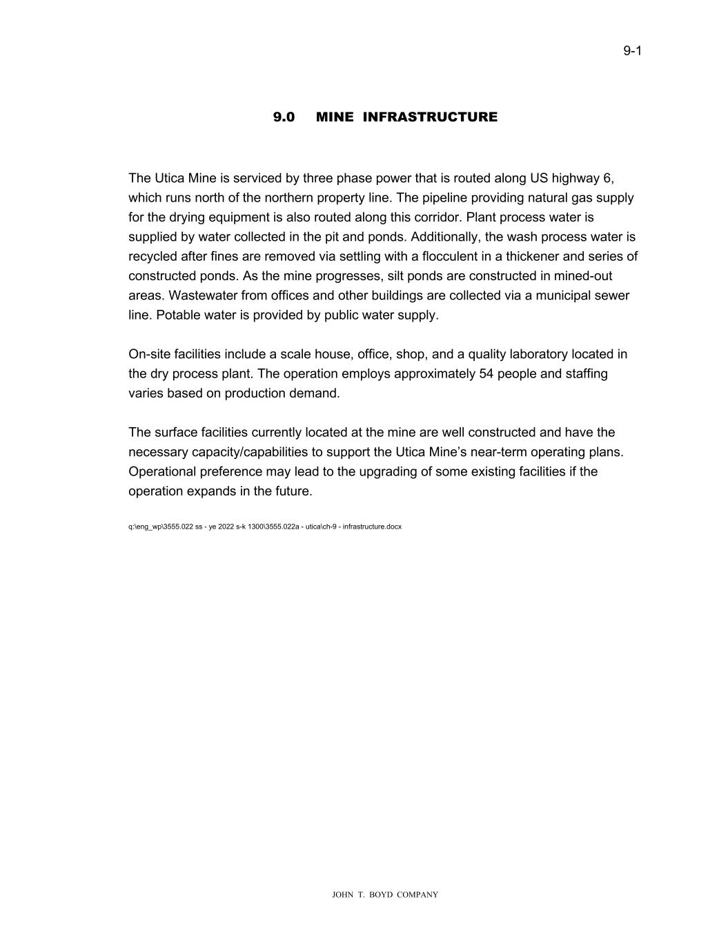 9-1 JOHN T. BOYD COMPANY 9.0 MINE INFRASTRUCTURE The Utica Mine is serviced by three phase power that is routed along US highway 6, which runs north of the northern property line. The pipeline providing natural gas supply for the drying equipment is also routed along this corridor. Plant process water is supplied by water collected in the pit and ponds. Additionally, the wash process water is recycled after fines are removed via settling with a flocculent in a thickener and series of constructed ponds. As the mine progresses, silt ponds are constructed in mined-out areas. Wastewater from offices and other buildings are collected via a municipal sewer line. Potable water is provided by public water supply. On-site facilities include a scale house, office, shop, and a quality laboratory located in the dry process plant. The operation employs approximately 54 people and staffing varies based on production demand. The surface facilities currently located at the mine are well constructed and have the necessary capacity/capabilities to support the Utica Mine’s near-term operating plans. Operational preference may lead to the upgrading of some existing facilities if the operation expands in the future. q:\eng_wp\3555.022 ss - ye 2022 s-k 1300\3555.022a - utica\ch-9 - infrastructure.docx
